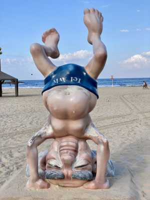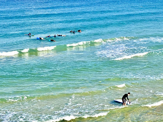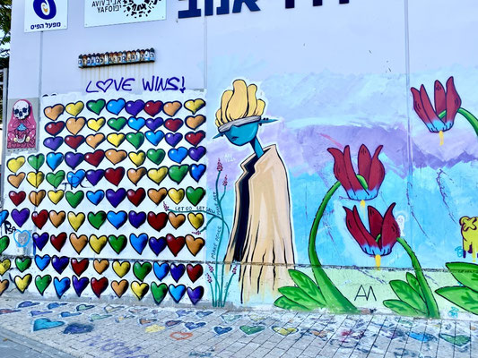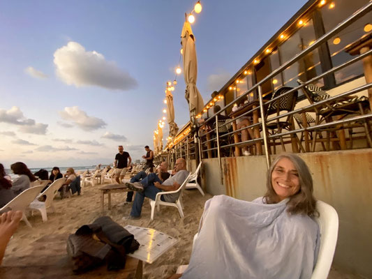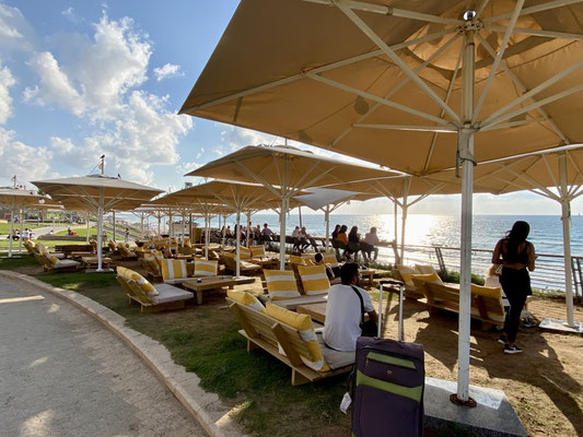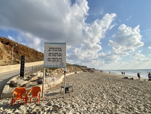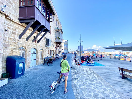 Wir erreichen Tel Aviv früh morgens um Sieben in der Hoffnung, einen Parkplatz in Beach Nähe zu ergattern. Es gelingt uns allerdings nicht in die Nähe der Beach zu fahren. Alle Strassen sind durch die Polizei gesperrt. Es findet diesen Morgen ein Fahrradrennen statt. Wir finden in einer Wohngegend einen guten Platz, packen unsere Fahrräder aus und folgen der Rennstrecke in die City. Der Promenade entlang, treiben von den über 460'000 Einwohner wohl etwa gefühlt 459’000 Sport. So etwas haben wir noch nie gesehen. Es hat so viele Jogger die so schnell sind, dass es sich anfühlt, als ob ein Marathon stattfindet. Im Wasser tummeln sich die Wellenreiter und im Sand die Beachvolleyballer/innen.