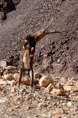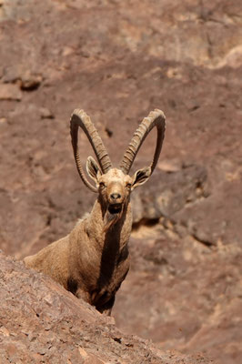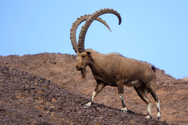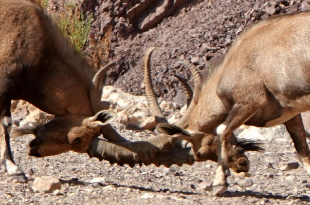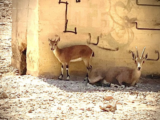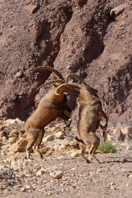 Wir fahren weiter in Richtung Süden nach Eilat. Wir suchen wie oft unterwegs eine Möglichkeit zu wandern und mehr Ruhe und Einsamkeit. Kurz vor Eilat werden wir fündig und machen halt in einem Wadi (Amram Columns). Soeben sind wir retour von einer kurzen Wanderung durch eine kleine, enge Schlucht, die das Wasser über Jahre geformt hat. An einigen Stellen sind wir froh, treiben wir regelmässig Sport und achten auf die Figur. Die Schlucht ist so eng, dass wir fast hängen bleiben. Die Tierwelt ist sehr vielfältig, so sehen wir Geier, bunte, kreischende und singende uns unbekannte Vögel, Gazellen und kämpfende nubische Steinböcke. Im Oktober ist Paarungszeit der Steinböcke und kämpfen um die Gunst einer Lady. Was sonst. Die Angebetete steht etwas abseits und schaut eher gelangweilt zu, nicht wie wir. Wir stehen in der ersten Reihe, ca. 20m entfernt. Die beiden Streithähne interessieren sich nicht für uns.