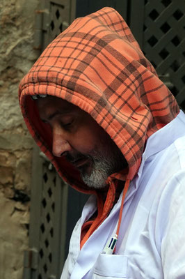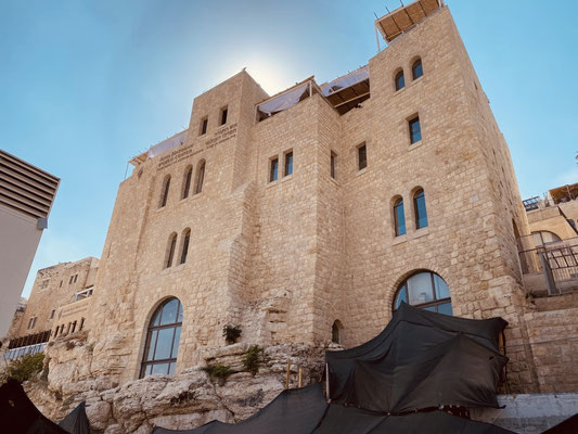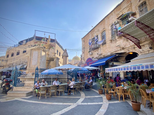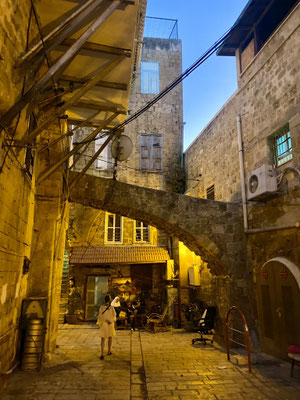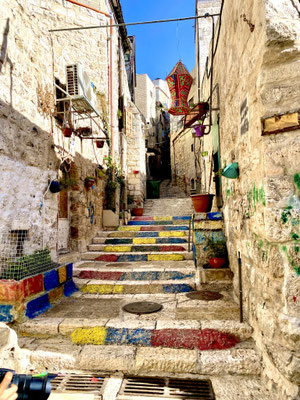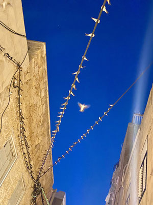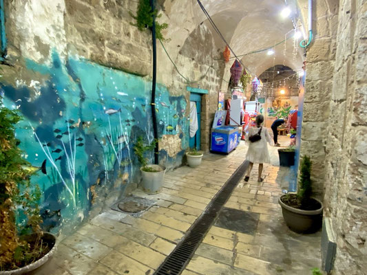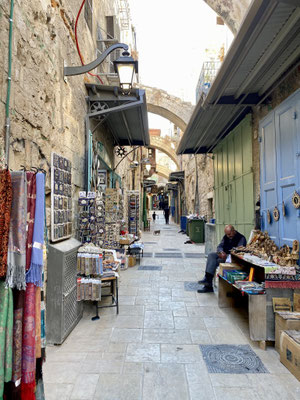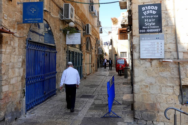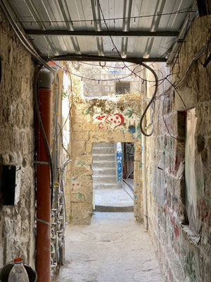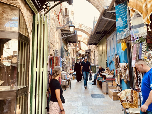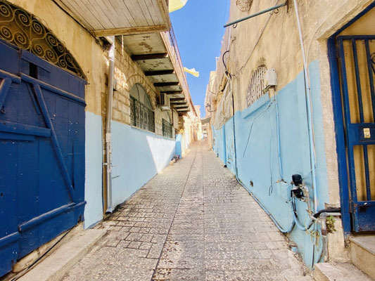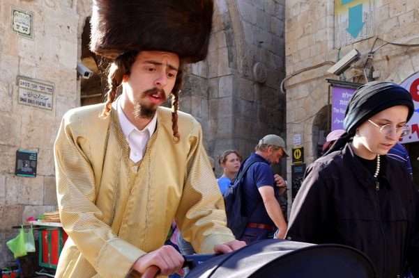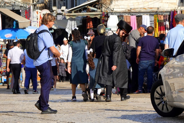 Weiter geht’s durch die vielen Gassen des Suks die erfüllt sind mit Gesängen, Gerüchen und vielen kitschigen Gegenständen. Hier leben Christen, Juden und Moslems auf engsten Raum miteinander, nebeneinander und dies führt immer wieder zu Spannungen wie wir selber beobachten konnten. Es ist eine eigenartige, mystische aber auch angespannt Atmosphäre. Wir beobachten eine Gruppe junger muslemischer Frauen, Spalier stehend singen sie in den jüdischen Gassen ihre Lieder. Die feiernde jüdische Gesellschaft fühlt sich dadurch provoziert. Was offensichtlich das Ziel der Gruppe ist. Es fallen laute, vermutlich unschöne Worte, wir verstehen sie nicht. Die Handzeichen die ein jüdischer Junge ins Gesicht der singenden Gruppe hält, sind allerding international für alle verständlich. Wir verlassen den gehässigen Ort schnell.