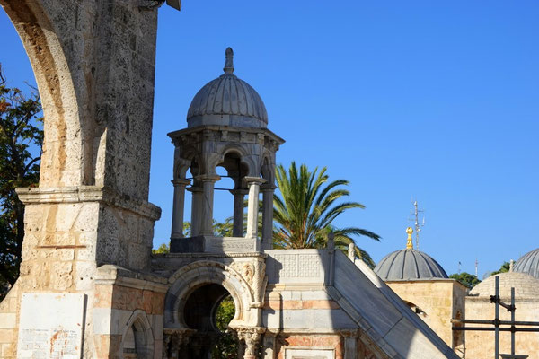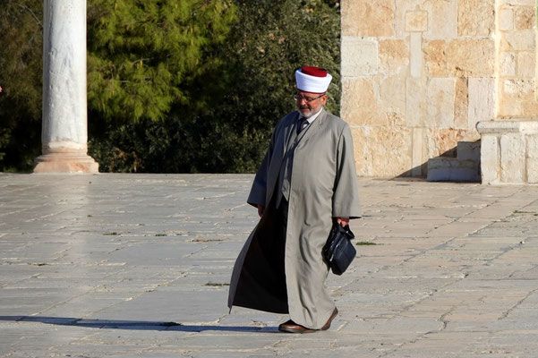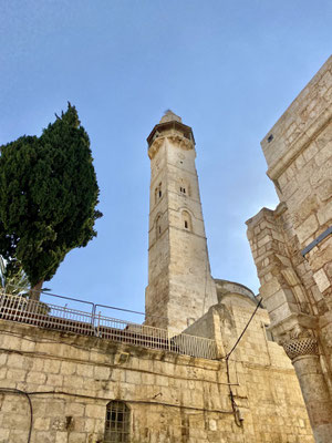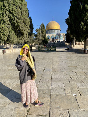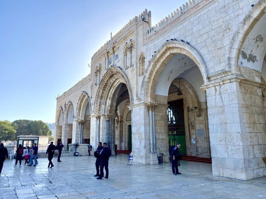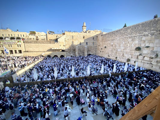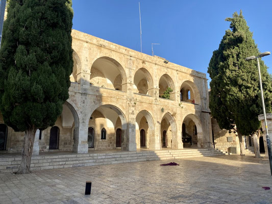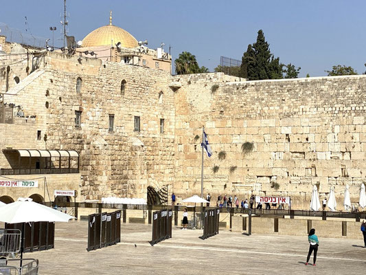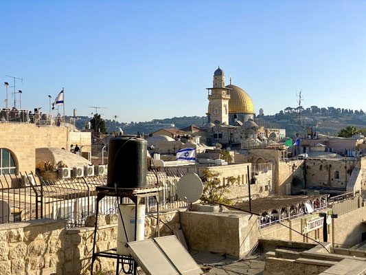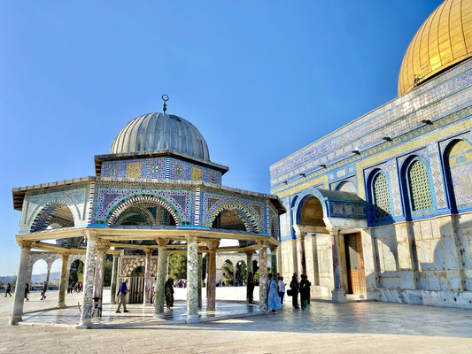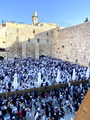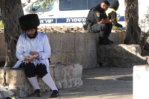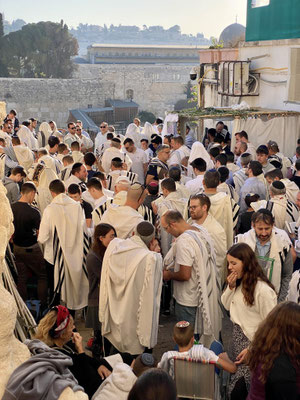 Wir staunen nicht schlecht als wir bei der Klagemauer eintreffen. Seht euch die eindrücklichen Bilder an. Wir müssen die Sicherheitsposten passieren und haben Glück, beim jüdischen Eingang durchgewunken zu werden. So konnten wir eine riesige Warteschlange umgehen. Wir schlängeln uns durch betende, singende und wippende Menschenmassen mit Ziel Tempelberg ins muslemische Viertel. Es sind in ganz Jerusalem viele Sicherheitskräfte anzutreffen. Die Frauen und Männer in ihren Kampfmonturen sehen furchteinflössend aus. Je mehr wir dem Tempelberg nähern desto mehr Sicherheitspersonal treffen wir. Jüdische Gruppen werden im muslemischen Viertel von Bodyguards begleitet. Wir können ohne Begleitung hinein. Oben angekommen werden wir durch unerwartete, wohltuende Ruhe begrüsst und lassen die Moschee auf uns wirken. Sie ist geschlossen, darin befindet sich ein grosser Stein in dem Geister leben sollen.