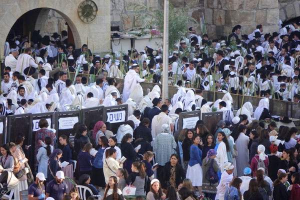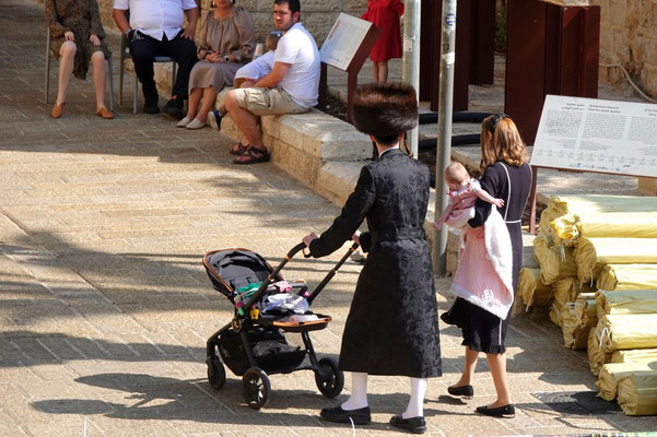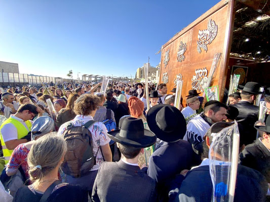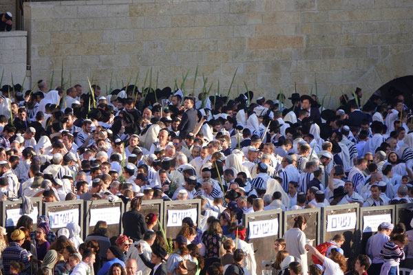 Wir starten heute schon um sieben Uhr und stellen fest, dass wir nicht die Einzigen sind, die den Wecker gestellt hatten. Tausende orthodoxe Juden sind an diesem Feiertag Simchat Tora (Feier der Tora) mit Palmenzweigen in der Hand unterwegs in die Synagoge bzw. zur Klagemauer. Simchat Tora ist gewissermassen der letzte Tag von Sukkut dem Laubhüttenfest was auch bedeutet, dass die Ferien zu Ende sind. Hurra! Wir sind bald wieder alleine unterwegs.