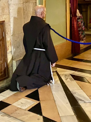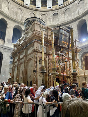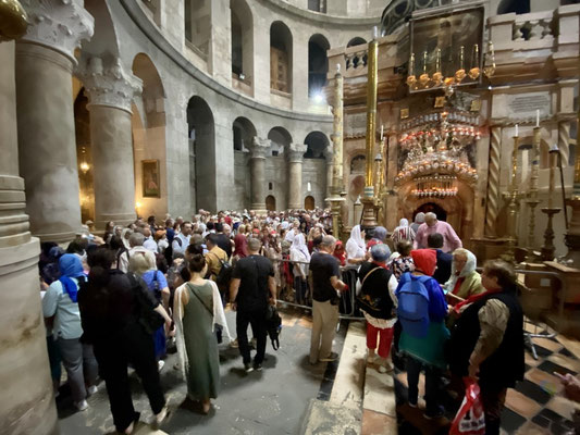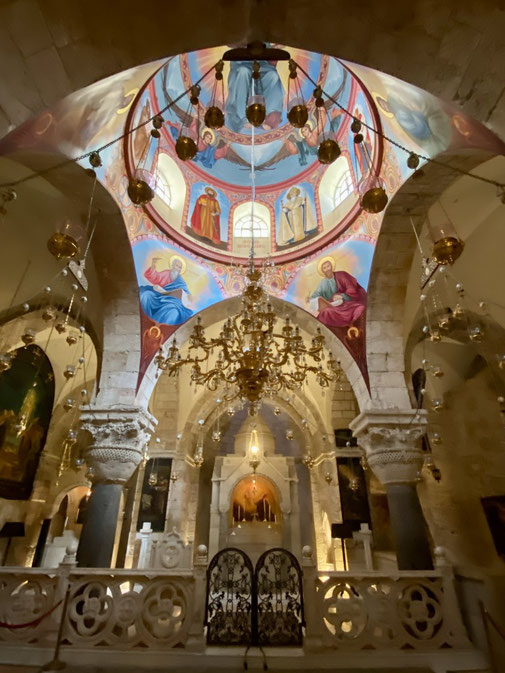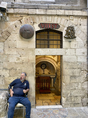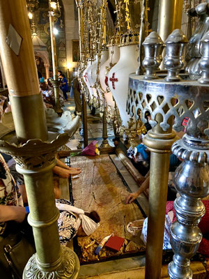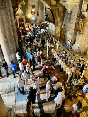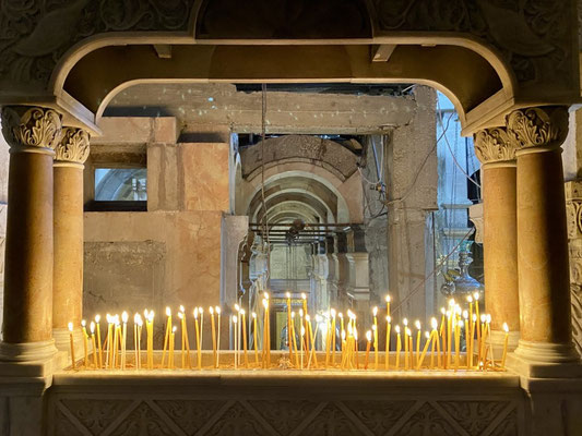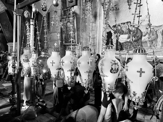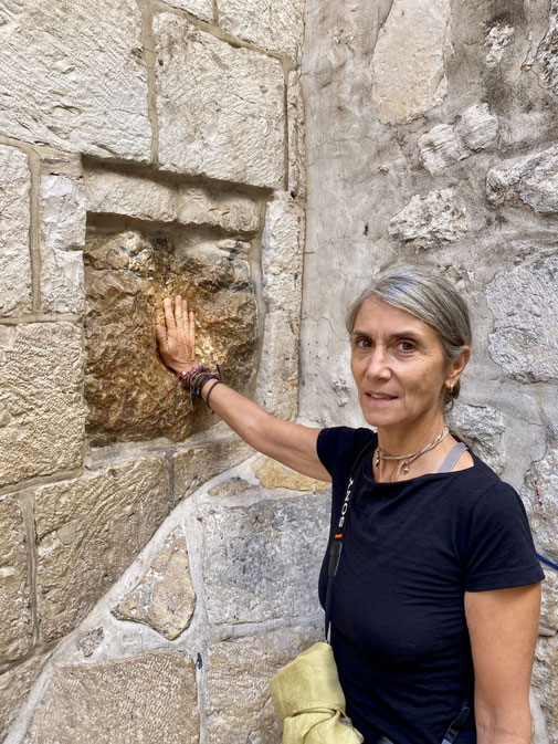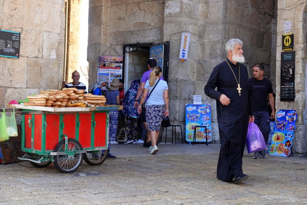 Den Davidsturm besichtigen wir von aussen, denn das Museum schliesst schon bald die Tore. Die «Via Dolorosa» ist, gemäss Überlieferung, die Gasse die Jesus mit dem Kreuz auf der Schulter durchschreiten musste zur Grabenskirche, wo er gekreuzigt wurde. Wir beobachten die Gläubigen, welche die Hauswand berühren, in dem der Jesus Händeabdruck verewigt sein soll. Hier soll er gestolpert sein und seine Hand an der Mauer abgestützt haben. Auch wenn ich solche Geschichten kritisch hinterfrage, zieht mich die Stelle magisch an und ich muss ebenfalls hin fassen. Wir sehen Menschen, die zwar kein Kreuz durch die Gasse tragen aber mit blutigen Händen durchpilgern. Der Glaube ist hier allgegenwärtig und spürbar. So auch in der Grabenskirche, eine der grössten Heiligtümern des Christentums. Die Kirche gilt als Ort der Kreuzigung, Grabstelle und Ort der Auferstehung von Jesus Christus. Dementsprechend lang sind die Warteschlangen vor den entsprechenden Kultstätten. Wir versuchen die Menschenmasse so gut wie möglich zu umgehen. Die Beine werden immer schwerer, der Kopf schwirrt langsam und wir beschliessen Morgen weiter zu machen. Heute Abend reicht es nur noch für eine Eiscreme ums Eck.