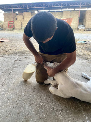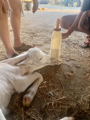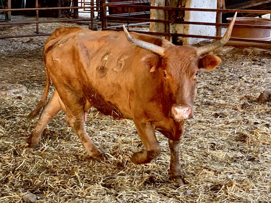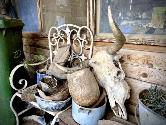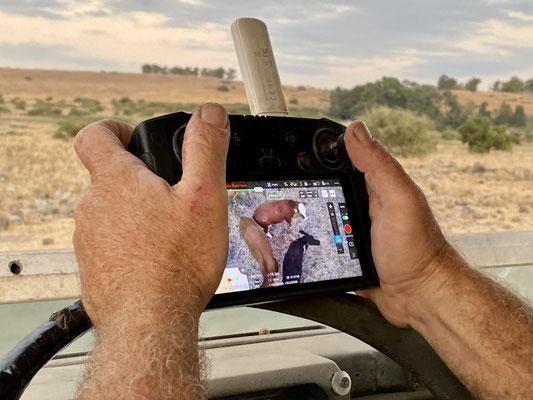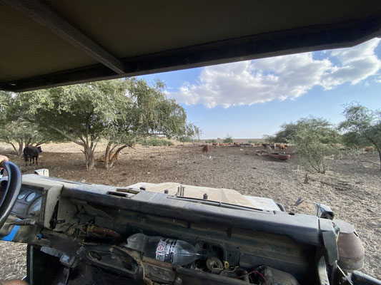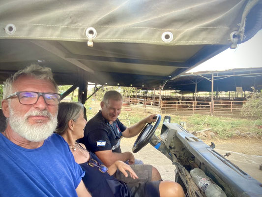 Nach einem angenehm kühlen «Schwumm» fahren wir entlang eines grossen Wasserreservoirs zum Hof mit Unterkunft, Stallungen, Werkstatt und Depots für Futter. Wir werden schon von Omer, einem kräftigen und sehr sympathischen Mann erwartet. Gestärkt und verköstigt mit selbstgemachtem Ziegenkäse, der Zohar herstellt, geht’s ab in einen der zahlreichen Landrovern auf dem Grundstück. Die coolen Fahrzeuge haben weder Frontscheiben noch Türen. Wir fahren durch die verschiedenen Zonen, die abhängig von der Jahreszeit für die Herden geöffnet oder geschlossen werden, sodass das Gras regelmässig wieder nachwachsen kann. In einem Abschnitt schauen und ca. 50 Bullen an. Die grössten sind gegen 1 Tonne schwer. Wir sind froh hat es einen robusten Zaun zwischen den stolzen Tieren und uns.