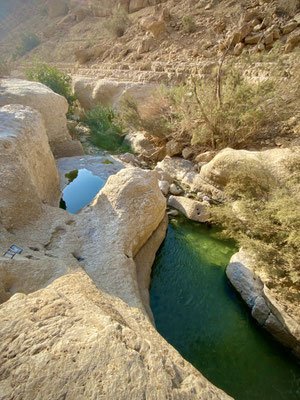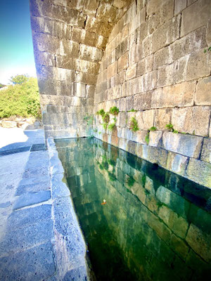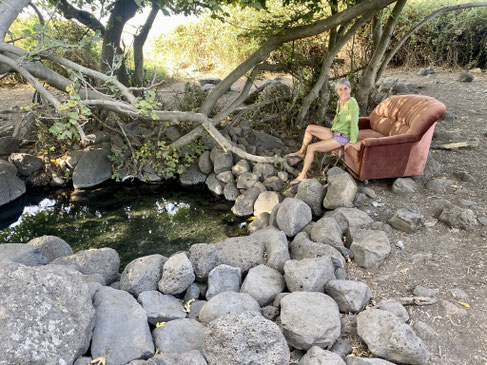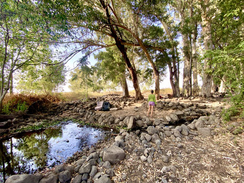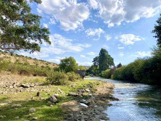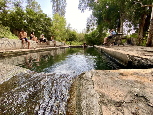 Im Norden, entlang der Golanhöhen haben wir diverse Sehenswürdigkeiten, die wir gerne besichtigt hätten. Am Ende haben wir praktisch alle sausen lassen, da wir nicht bereit sind für einen Spaziergang zu einem Wasserfall oder einer kleinen Wanderung in ein Tal hohe Eintrittspreise zu bezahlen. So beschliessen wir nach Katzrin, einer kleinen Stadt in den Golanhöhen zu fahren. Bei der Suche eines geeigneten Stallplatz für die Nacht, haben wir einen sehr speziellen, mystischen Ort gefunden. Es sieht aus wie in einer Oase. Der kleine Naturpool ist eiskalt und mit glasklarem Wasser gefüllt, umgeben von Feigen und Eukalyptusbäumen.