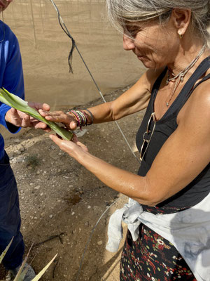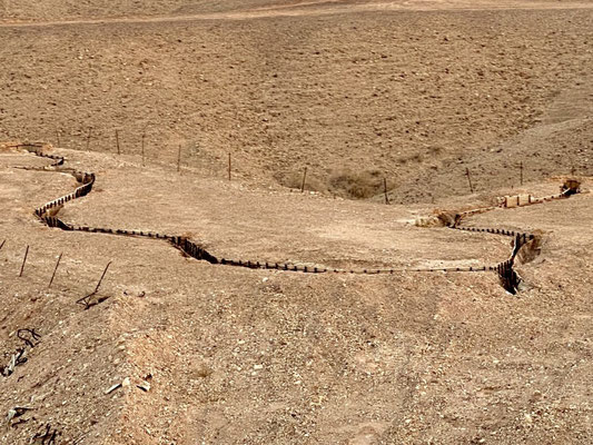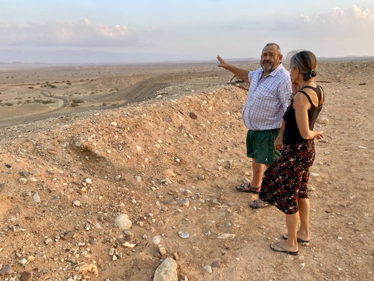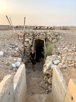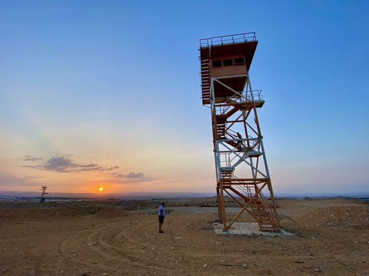 Unsere Tour mit Izzy beinhaltet auch eine Führung entlang der Jordanischen Grenze. Er ist ein grossartiger Erzähler. Eid Yahav liegt unmittelbar an der Grenze zu Jordanien. Vor vielen Jahren gab es immer wieder Konflikte mit den Jordaniern, so erzählt er uns. Man hat sich deshalb mit der damaligen Premierministerin Golda Meir am Telefon beraten. Sie empfahl die Zäune zu verschieben um dem Konflikt entgegenzuwirken. So haben sie beschlossen, die Grenzzäune zu verlegen, dass die Felder weiter weg von der Grenze liegen. Nein! Sie haben die Zäune in Richtung Jordanien verschoben. Das Militär ist geflüchtet und Israel ein paar Quadratmeter grösser geworden. Wir durchschreiten die stillgelegten Bunker und besteigen den alten Wehrturm mit freier Sicht nach Jordanien. Nur ein kleiner Zaun trennt uns von Jordanien. Heute ist die Beziehung zu Jordanien sehr gut, erwähnt Izzy mehrfach. Weiter gings zum «Babymaker» Hill. Auf dem Hügel mit Sicht auf den Sonnenuntergang, lauschen wir weiteren spannenden Geschichten. Die jungen Leute fahren hier nachts hin um sich zu vergnügen, deshalb «Babymaker Hill». Zurück im Auto werden wir mit Gemüse und Datteln für die nächsten zwei Wochen eingedeckt. Ich mache mich gleich an die Arbeit und verarbeite (waschen, schnipseln, pürieren) das Gemüse zu Pesto Sauce oder fermentiere es und bereite einen scharfen Hummus aus Auberginen vor.