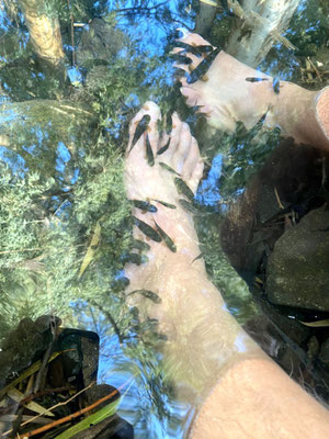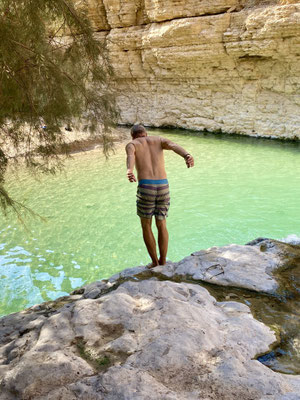 Wir sind mit dem Velo quer durch den Kibbuz geradelt und haben Menschen bei der Meditation, Massage, schwimmend oder tanzend unter Palmen beobachtet. Auffallend ist die friedliche angenehm ruhige Stimmung. Auch wir haben es uns nicht nehmen lassen im lauwarmen klaren See zu planschen.