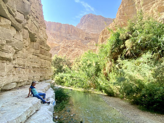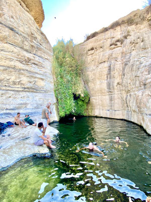 Heute folgen wir einer Wanderempfehlung von Lea und verlassen die liebenswerten Menschen. Das frühe Aufstehen hat sich gelohnt und wir befinden uns bald in dichten, schattigen Rhododendren Wälder. Genüsslich erfrischen wir uns unter dem Wasserfall, einfach herrlich bei diesen Temperaturen. Durch die Tipps der Einheimischen können wir nun Wandern und Baden ohne die horrenden Eintrittspreise der Touristenhotspots zu bezahlen. Weiter geht’s nach Ein Keshatot wo wir eine archäologische Ausgrabung besichtigen, welche sehr Aufwendig mit 3 D Animationen und vielen technischen Hilfsmittel eine Synagoge mit den originalen Steinen rekonstruiert wurde. Es ist aber einfach zu heiss um lange in der Ausgrabung rumzulaufen und wir sind schnell wieder im kühlen Auto.