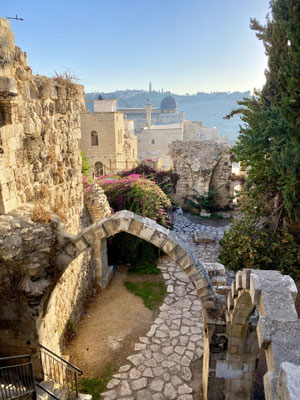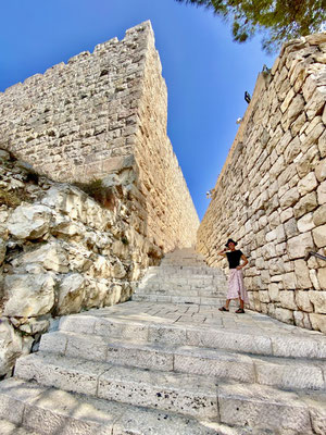 Jerusalem ist ein Wechselbad zwischen unterschiedlichen Kulturen und Glaubensrichtungen sowie Gegenwart und Vergangenheit. Auf diesem Fleck Erde fand Weltgeschichte statt. Wir schreiten ehrfürchtig durch die alten Gassen in die Altstadt die von einer riesigen Stadtmauer aus dem 16. Jahrhundert umgeben ist. Der geschichtsträchtige Stadtkern kann über sieben verschiedene Tore betreten werden und ist in vier Bezirke eingeteilt. Es gibt ein jüdisches, christliches, armenisches und muslemisches Viertel. Wir schlendern durch den arabischen Suk sowie das christliche und armenische Viertel. Besonders beeindruckt hat uns die Klagemauer, wobei sie verglichen mit der religiösen Bedeutung eher klein ist. Sie ist das Überbleibsel einer zerstörten Tempelanlage. Gläubige stecken kleine Zettel mit Gebeten und Bitten in die Nischen zwischen den Steinen. Zweimal im Jahr werden sie eingesammelt und auf dem Ölberg beerdigt, denn wo der Name Gottes draufsteht darf im Judentum nichts verbrannt werden.