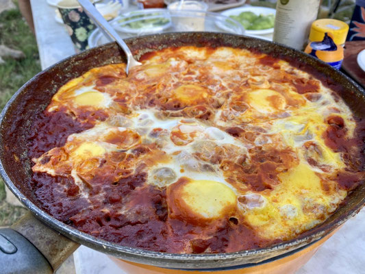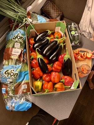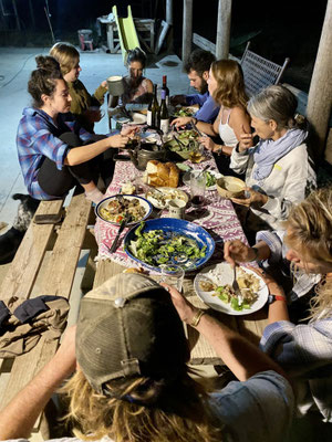 Abends sitzen wir mit der Familie, den Arbeitern und ihren Freundinnen zusammen und geniessen ein herrliches Essen. Ich bin hier als Vegi im Foodheaven. So viele leckere Salate, Hummus, Linsen und Aubergine Varianten.