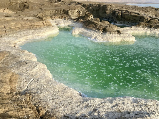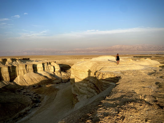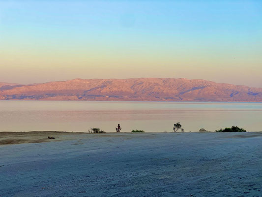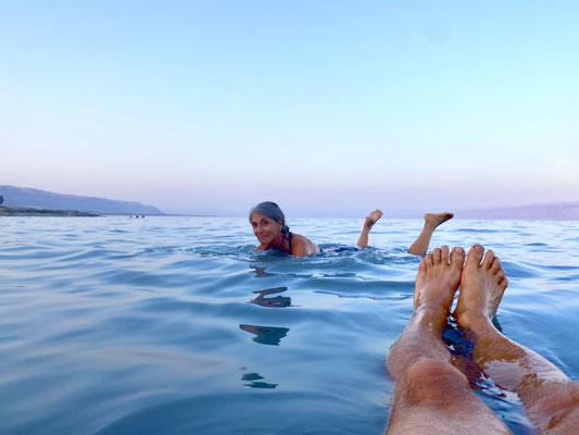Totes Meer, gibt es das überhaupt? Existiert darin wirklich kein Leben? Jein, bei ca. 30% Salzgehalt ist, ausser Bakterien, keine Leben möglich. Zum Vergleich, das Mittelmeer hat einen Salzgehalt von lediglich 3%. Wir befinden uns mit -430m an einem der tiefsten Punkt der Erde was in den Ohren gut wahrnehmbar ist. Wahnsinn! Kaum angekommen, schweben wir auch schon auf den sanften Wellen das Toten Meers. Wir fühlen uns wie ein Quietscheente in der warmen Badewanne. Auf dem Bauch liegend ploppen die Fusssohlen unmittelbar an die Wasseroberfläche also drehen und auf dem Rücken durch das warme Wasser gleiten. Ein ungewohntes aber wunderschön angenehmes und sehr entspanntes Gefühl, dass wir gerade empfinden.