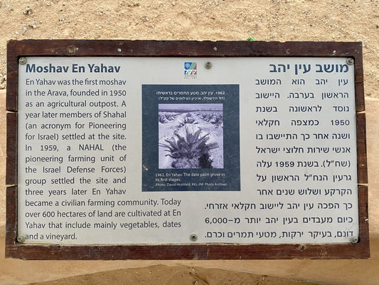 Heute werden hier Zucchini, Peperoni, Aubergine, Aloe Vera, Tomaten, Gurken, Trauben und Kräuter angepflanzt. Es gibt auch erste Versuche mit Avocado und Pampelmuse. Riesige Flächen Agrikultur prägen heute das Bild in Mitten der Wüste. Die unzähligen Palmen stehen hier in Reih und Glied und prägen das Bild dieser künstlichen Oase. Aus dieser heissen, trockenen Gegend Israels stammen die grossen, fleischigen Medjoul Datteln. Sie sind besser als jede Praline!