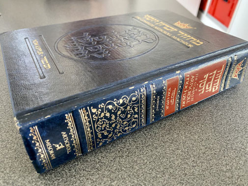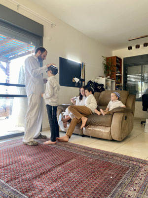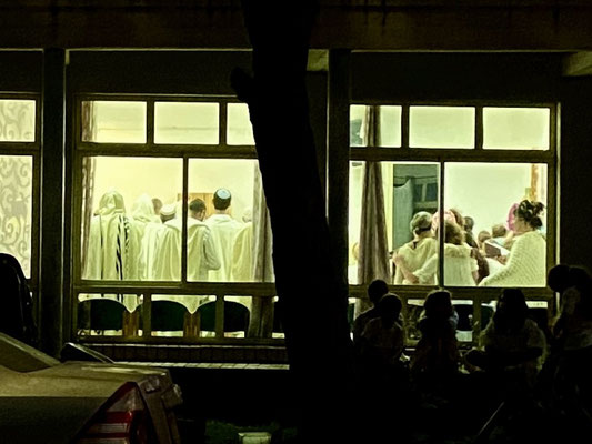 Die Männer tragen an diesem heiligen, speziellen Abend wie auch Morgen von Yom Kippur weisse Kleidung und eine Kopfbedeckung wie ein Art Zylinder oder die Kippa. Eine Stola mit Kapuze bedeckt die Schultern. Die Frauen kleiden sich sehr hübsch und bedecken die Haare mit wunderschönen kunstvoll arrangierten, bunten und behangenen Turbanen. Es kann aber auch ein Hut oder nur ein Stirnband sein. Viele sind mit Flip-Flops oder Barfuss unterwegs, denn Lederschuhe sind an diesen Tagen verboten. Dani, ganz in weiss (das blaue Oberteil wechselt Dani später), und ich begleiten die Familie in die Synagoge. Wir erhalten eine englische Buchvariante des Yom Kippur-Gebetsbuch und Lea zeigt mir immer wo wir sind. Es ist sehr eindrücklich wir stehen oder sitzen und beten, singen oder lesen still. Es ist ein stetiges kommen und gehen auf der Frauenseite. Ich beobachte das Treiben und Geschehen voller Neugier. Auch im Freien vor der Synagoge wird gebetet oder sie sitzen in kleinen Gruppen zusammen und unterhalten sich während sich die Kinder laut und lebendig im angrenzendem Spielplatz Vergnügungen. Jeder so wie es ihm beliebt. Auffallend ist, dass keine der vielen Frauen geschminkt ist. Sie sind sehr natürlich, zurückhaltend und strahlen eine innere Ruhe aus. Ein einmaliges unglaubliches Privileg, dass wir hier erleben dürfen.