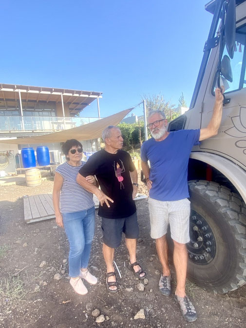 Zurück im Fahrzeug ruft uns ganz aufgeregt Yossi an. Yossi lebt in Tel Aviv und hat sich in Deutschland ein Unimog bei der Firma Hellgeth gekauft und lässt ihn, wie wir, bei der Firma umbauen. Unsere Nummer hat er von Hellgeth bekommen. Er hat tausend Fragen zum Fahrzeug und möchte uns heute noch treffen. Klar machen wir, wir wollten eh gerade los um eine kleine Winery im Städtchen Natur zu besuchen => Link. Wir verabreden uns also dort zu einer Weindegustation. Dani möchte sich einige gute Flaschen gönnen. Mika, die Besitzerin ist 6-fache Mutter praktiziert Yoga und Meditiert. Die Chemie passt auf Anhieb. Kaum am Degustieren kommt Yossi und seine Frau angefahren und setzen sich zu uns. Der ehemalige Militärpilot ist voll auf zack und löchert uns mit Fragen. Die Beiden besichtigen den Unimog, welcher mittlerweile im Garten der Winery parkt. Wir dürfen hier schlafen, duschen und wenn wir wollen auch mitessen. Mika tischt viele Köstlichkeiten auf und setzt sich dazu. Wir könnten auch im Haus schlafen, denn 3 von Mikas Kindern sind im Militär, wie sie uns Stolz erzählt.