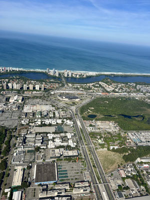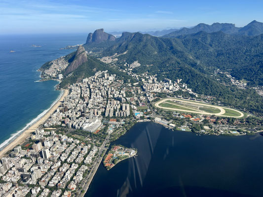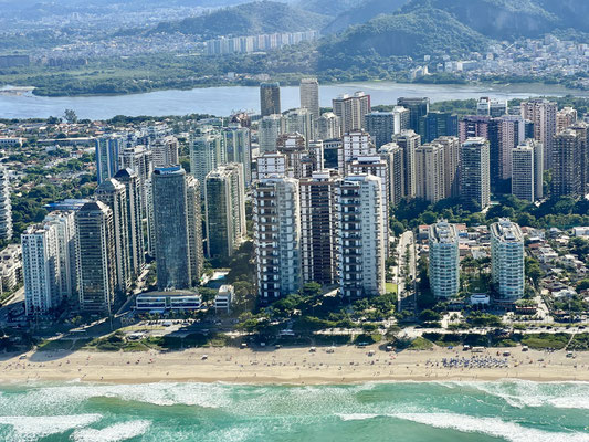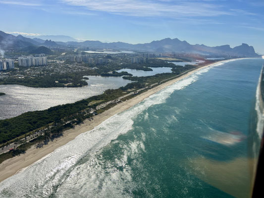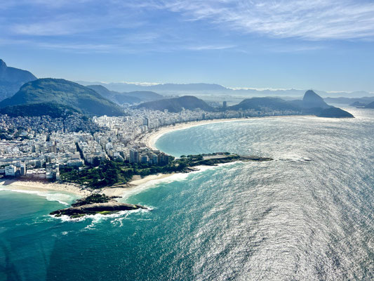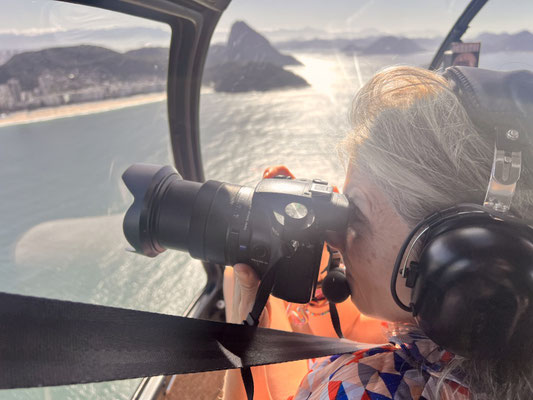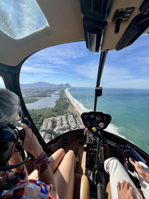 Kaum hebt der Heli ab, breitet sich Rio de Janeiro wie ein gigantisches Gemälde unter uns aus. Die Strände von Copacabana und Ipanema glänzen in der Morgensonne, das Meer funkelt bis zum Horizont. Der Wind rüttelt heftig an unserer Kabine – ich sende ein stilles Stossgebet, wohin auch immer.