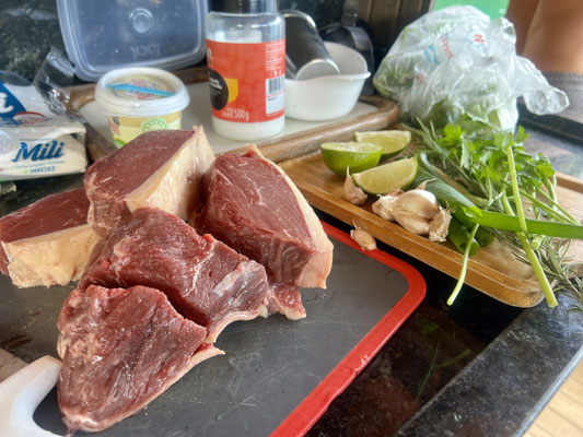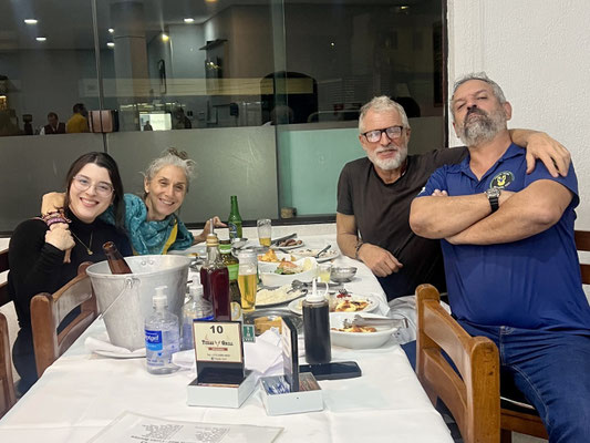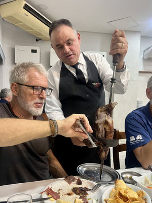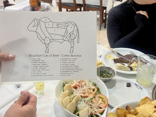 Hier landen nicht einfach Fleischberge auf dem Teller – hier wird gefühlt der halbe Tierbestand serviert. Während Dani, Ricardo und Julia (seine Tochter) bereits das zwölfte Stück Picanha geniessen, halte ich mich lieber am reichhaltigen Beilagen Buffet. Die Fleischspiesse sind üppig bestückt: Hühnerherzen, Lamm, Lachs und noch vieles mehr, was da so durch die Luft gewedelt wird.