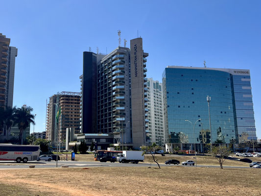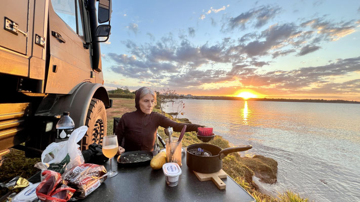 Wir erreichen die Stadt am späten Nachmittag – ohne Stress, ohne Stau. Auf breiten, fast leeren Avenidas durchqueren wir die geometrisch geplante Metropole und steuern unseren Nachtplatz an. Kurz vor Sonnenuntergang sitzen wir direkt am künstlich angelegten Lago Paranoá, essen gemütlich und blicken auf die Silhouette der Stadt im Abendrot.