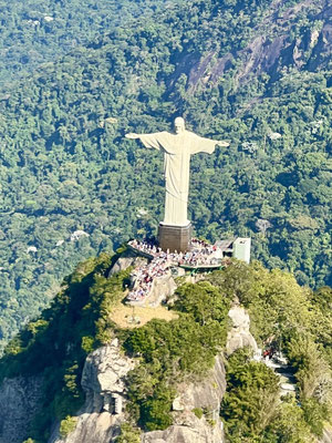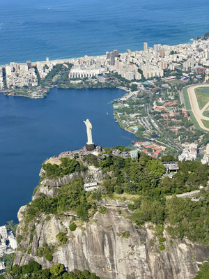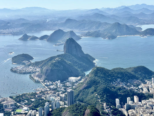 Wir fliegen dicht am Zuckerhut vorbei – so nah, dass wir die Seilbahn erkennen. Ein Schwenk – und der Corcovado mit der Christusstatue liegt vor uns. Selbst aus dieser Höhe wirkt die Figur gewaltig und majestätisch, mit weit ausgebreiteten Armen über der Stadt.