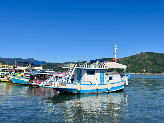Im Hafen warten bunte Boote auf Touristen – bereit für Inselhopping, Schnorcheltouren und Sonnenuntergänge.