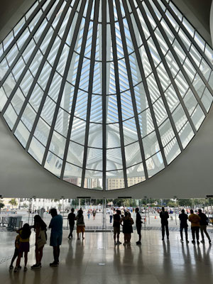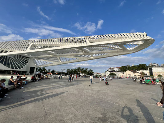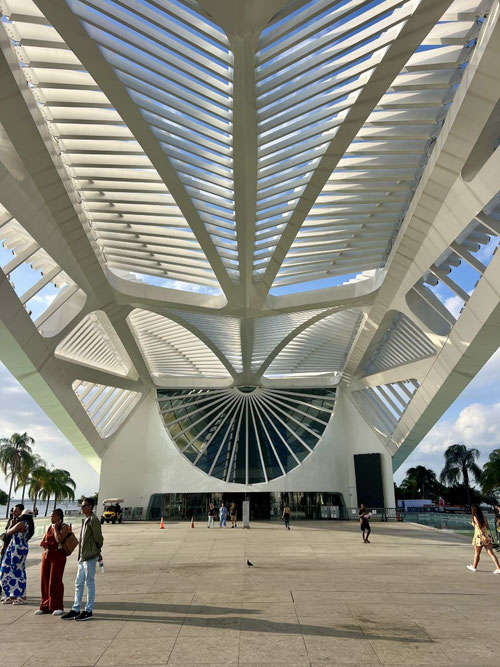 Mein nächstes Ziel: das Museu do Amanhã – das „Museum der Zukunft“. Schon von aussen ist das Gebäude ein echter Hingucker. Die Architektur erinnert an das Skelett eines riesigen Walfisches, der am Hafen gestrandet ist – futuristisch, filigran, beinahe schwebend.