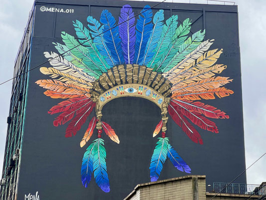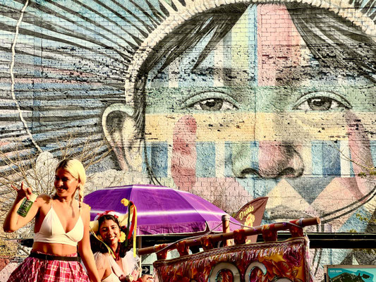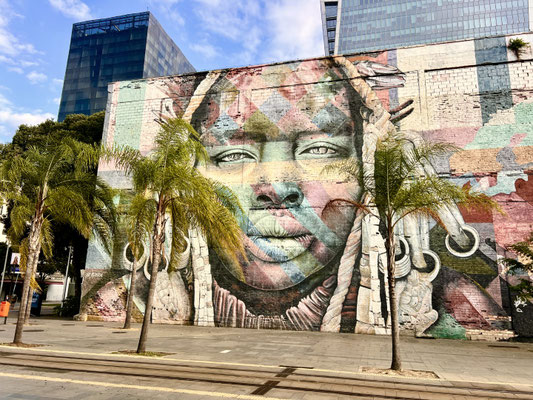 Kaum angekommen, fahren wir direkt und problemlos zu einem gesicherten Stellplatz. Von dort bestellen wir uns einen Transport ins Zentrum. Schon auf dem Weg bestaunen wir riesige Murals, Wandbilder, die eindrucksvoll von der Geschichte der Indigenen erzählen.