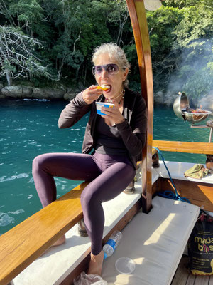Da ich inzwischen weiss, dass brasilianische Ausflüge meist von Fleisch und Meeresgetier dominiert werden, habe ich mir vorsorglich einen kleinen Vegi-Proviant eingepackt.