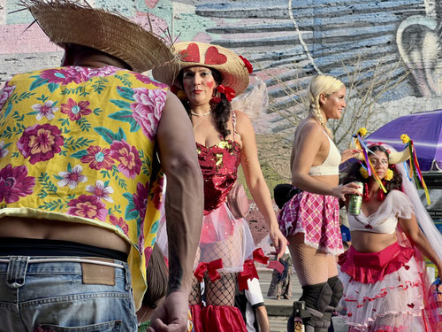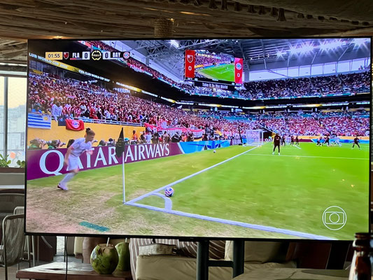 Vor dem Eingang des Public Viewings zieht sich eine endlose Schlange rot-schwarzer Trikots durch die Menge. Die Stimmung ist ausgelassen, fröhlich – und die Luft vibriert im Takt der Sambarhythmen. (Und ja, stellt sie euch vor: die tanzenden, schönen, sexy Menschen – genauso ist es.)