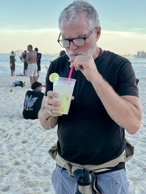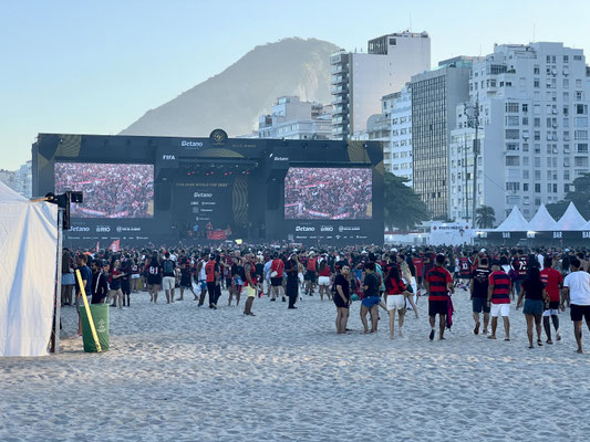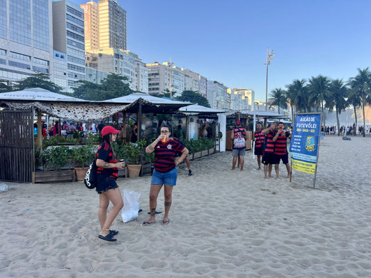 Der Sand ist voller Leben: Kinder planschen vorsichtig im Wasser, während meterhohe Wellen anrollen. Erwachsene schlürfen Caipirinhas, lachen, entspannen – und warten gespannt auf das Highlight des Tages: Flamengo gegen Bayern München.