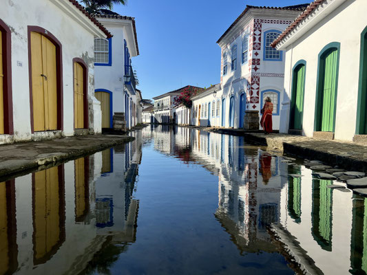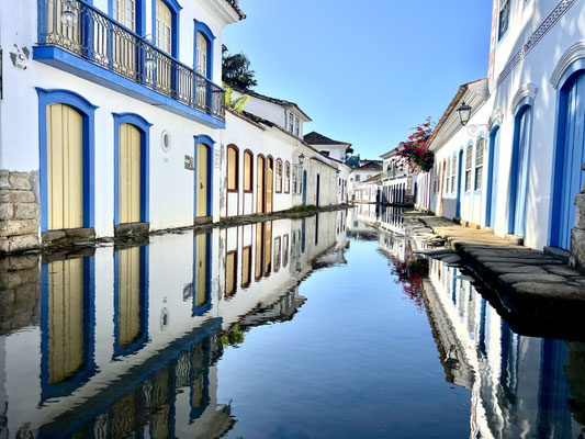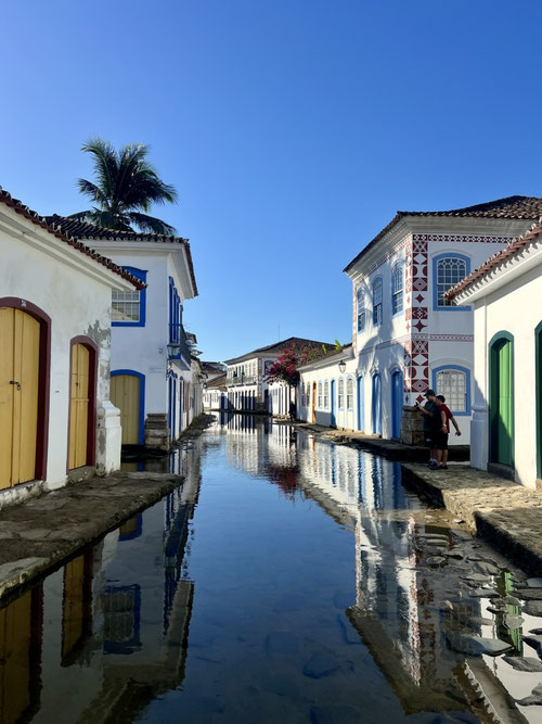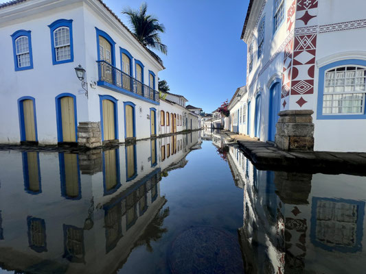 Am Abend spiegeln sich die Laternen im nassen Pflaster, wenn sich das Meerwasser bei Flut langsam durch die Gassen schleicht – ein besonderes Phänomen, das Paraty berühmt gemacht hat.