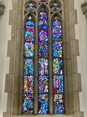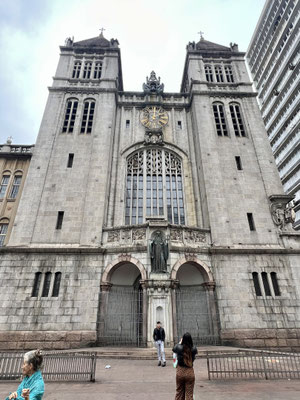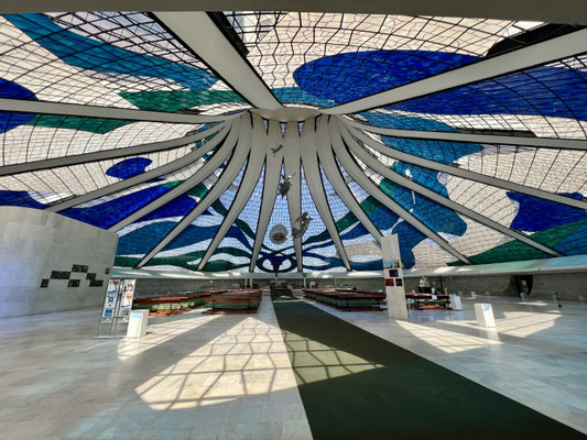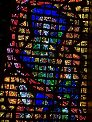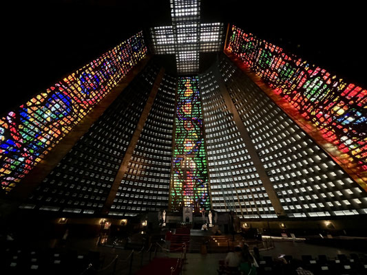 Von der Armut direkt zur Religion, wo es nicht an Geld fehlt. Die Kathedrale von Rio, ein Betonmonolith, wirkt wie ein gelandetes Raumschiff. Doch innen überraschen uns die farbigen Fensterbilder, die die drückende Stimmung im Innern durchbrechen.