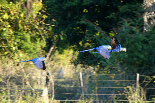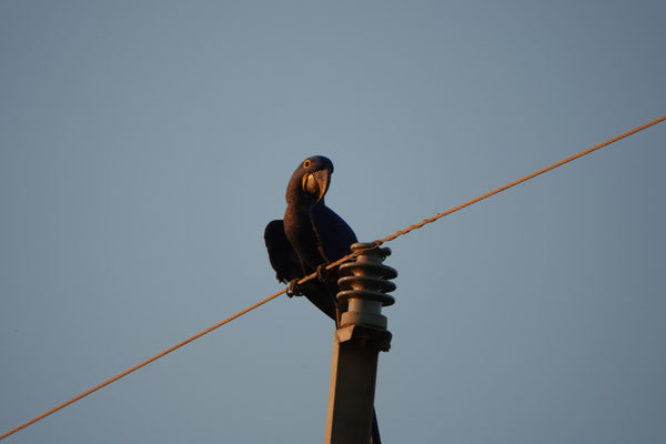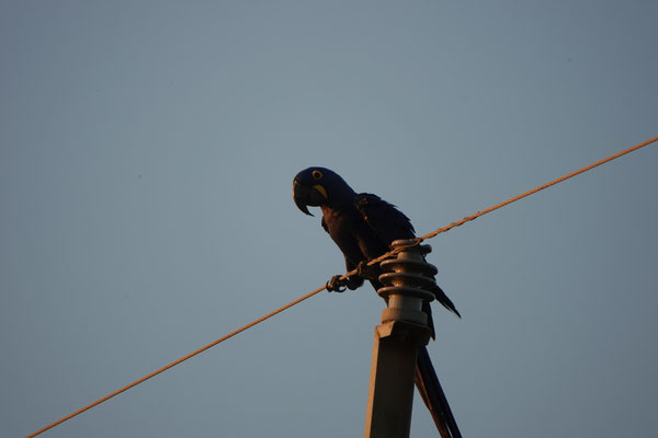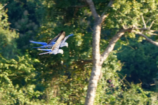 Dann beginnt die Suche nach den blauen, kreischenden Flattervögeln. In der Mittagshitze döst alles, als wäre das Leben auf „Pause“ gedrückt. Gegen vier Uhr stehen wir auf einer Palmenlichtung – den Lieblingsbäumen der Aras – und warten. Kamera und Feldstecher im Anschlag. Plötzlich höre ich sie, diese markanten Schreie – und da sind sie: drei prächtige blaue Riesenpapageien, majestätisch im Flug. Mit über 1,5 Metern Spannweite sind sie die unangefochtenen Giganten unter den flugfähigen Papageien.