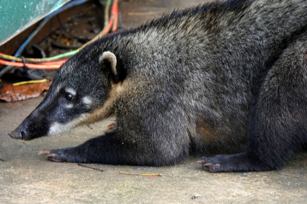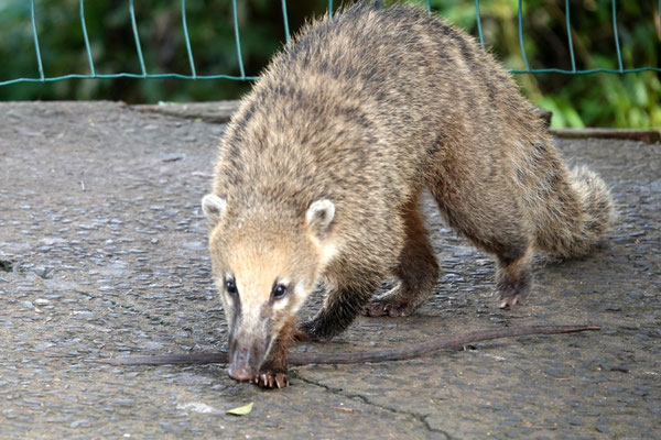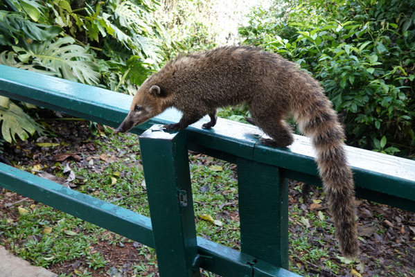 Solche Augenblicke zeigen, wie winzig wir Menschen sind. Langsam füllt sich die Plattform, wir treten den Rückweg an. Auf dem Panoramaweg soll es Nasenbären geben – nur sehen wir keine. Ich will sie aber unbedingt sehen. Also drehen wir um, laufen noch einmal gegen den Strom – nichts. Zurück, noch ein Versuch – und da sind sie! Putzig, neugierig, aber eben doch wild. Jetzt fehlt nur noch der Tapir, der Regenbogen hat sich ja gezeigt.