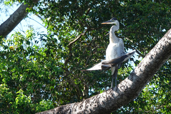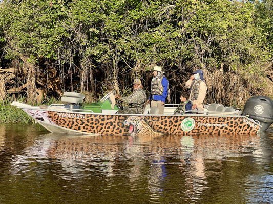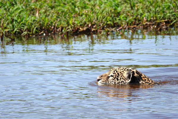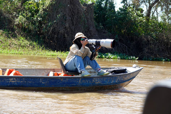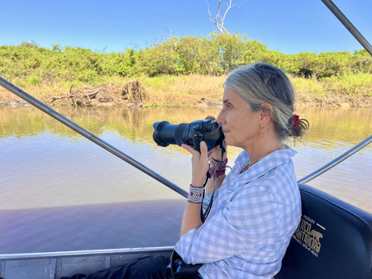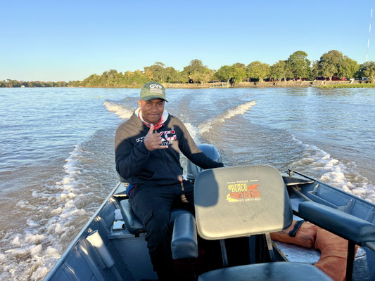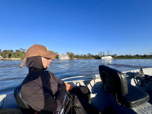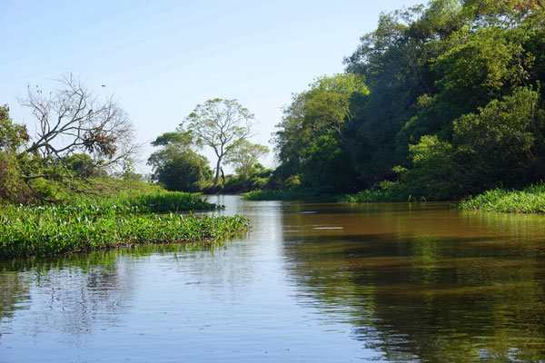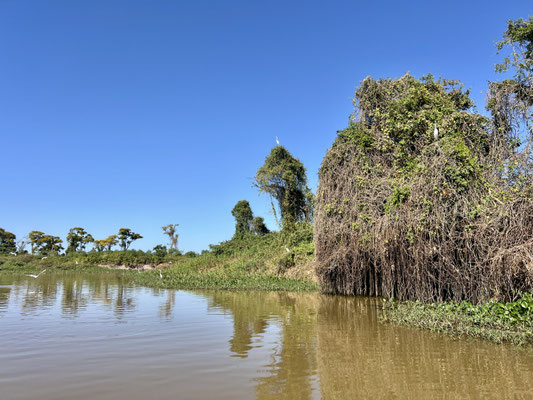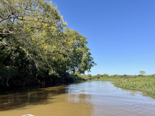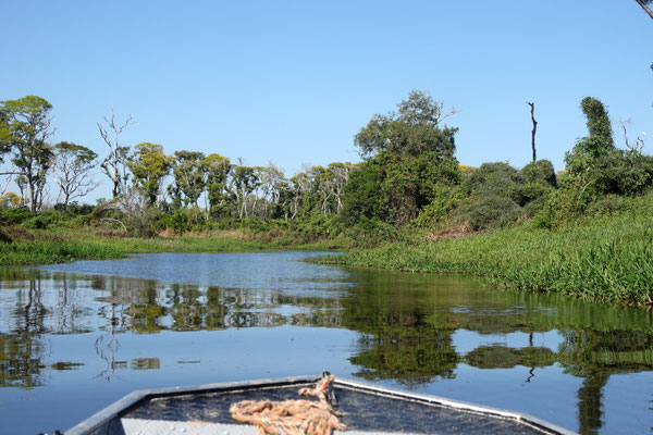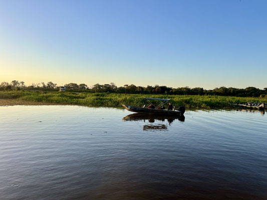 Eine ganztägige Bootstour haben wir im Voraus gebucht – in der grossen Hoffnung, Jaguare in freier Wildbahn zu sehen. Frühmorgens gleiten wir über das spiegelglatte Wasser des Rio Cuiaba. Das Labyrinth aus Flüssen und Lagunen liegt still vor uns, während sich die Sonne langsam durch das Dickicht kämpft. Ich habe nichts dagegen, wenn sie sich noch ein wenig Zeit lässt – denn schnell wird es drückend heiss. Zum Glück sorgt der Fahrtwind dafür, dass die Hitze und die Mücken erträglich bleiben.