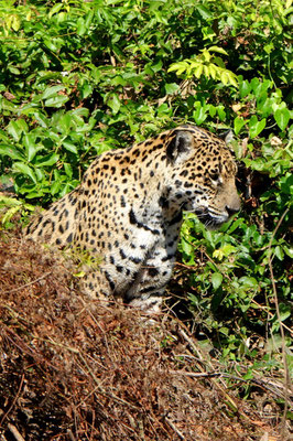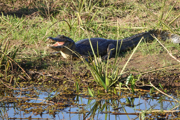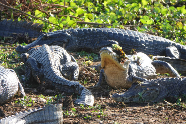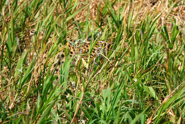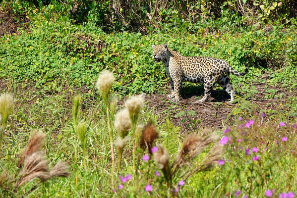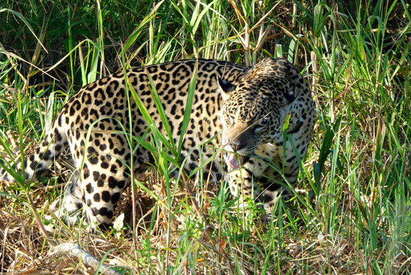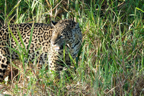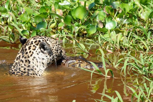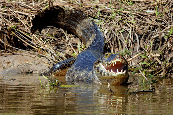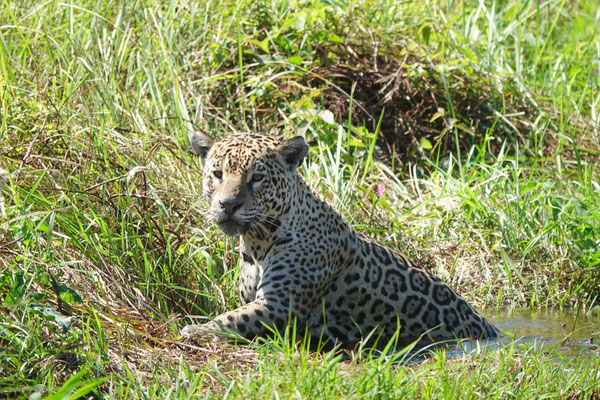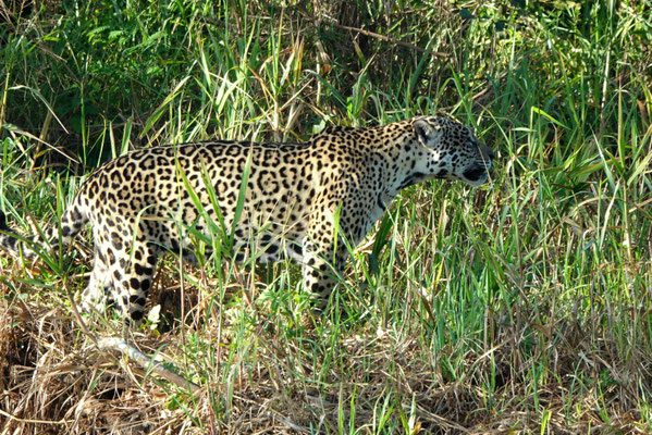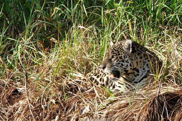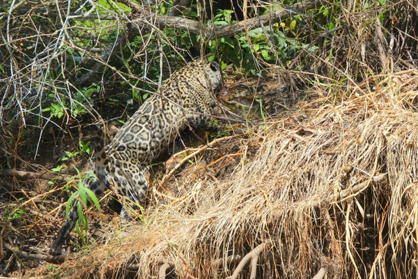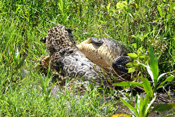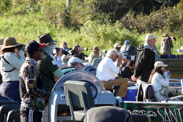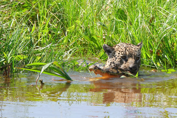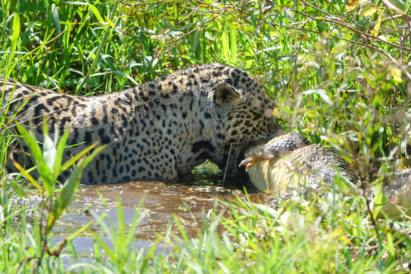 Dann passiert es: Am Ufer liegt unser erster Jaguar. Majestätisch, kraftvoll, ein Anblick, der uns sprachlos macht. Und wir haben Glück – wir sehen mehrere: schwimmend, dösend, jagend. Einer davon springt plötzlich mit einem gewaltigen Satz ins Wasser und packt einen der offenbar 10 Millionen Kaimane im Pantanal. Wasser spritzt, Vögel stieben in alle Richtungen. Der Kampf ist kurz, aber intensiv – und für den Jaguar sicher kräftezehrend. Wir sind Zeugen einer atemberaubenden Szene: wild, roh, kraftvoll und unvergesslich. Da es über zehn Millionen Kaimane im Pantanal gibt, gönne ich der Raubkatze ihren Fang von Herzen.