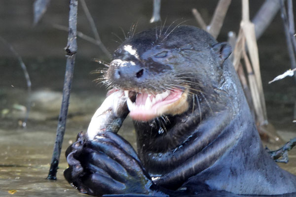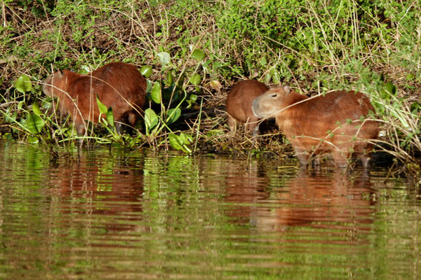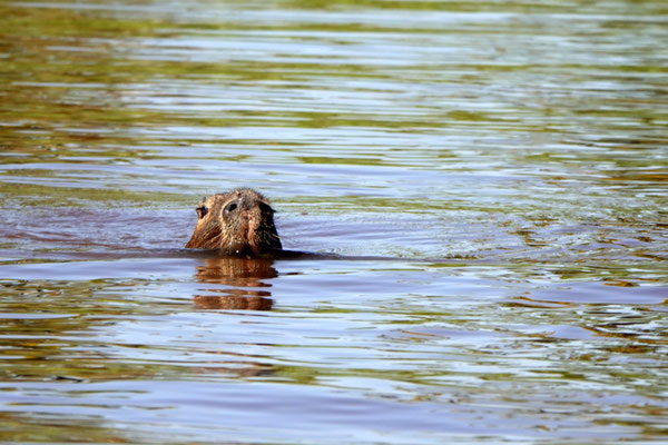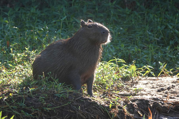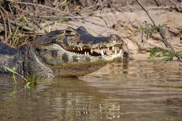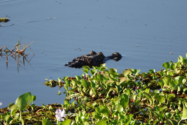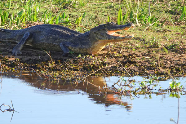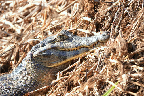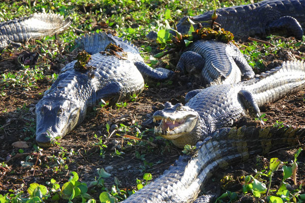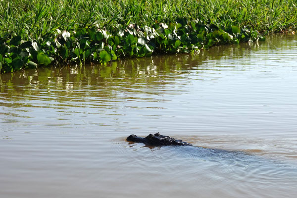 Noch im Hafen sichten die ersten niedlichen Capyvaras, gefolgt von Riesenottern. Das fängt ja gut an! Nicht weit entfernt blitzen die ersten Kaimane in der Sonne. Sie scheinen ein cooles Lächeln aufgesetzt zu haben, trotzdem flössen sie mir Respekt ein – besonders, als einer anfängt zu fauchen, weil Dani mit seiner GoPro zu nahekommt. Wir fahren an hunderten kreischenden Vögeln vorbei und versuchen, einige für euch einzufangen – fotografisch natürlich.