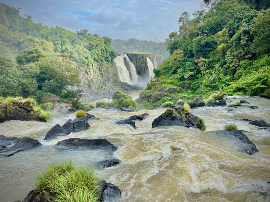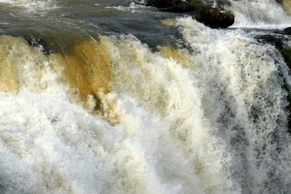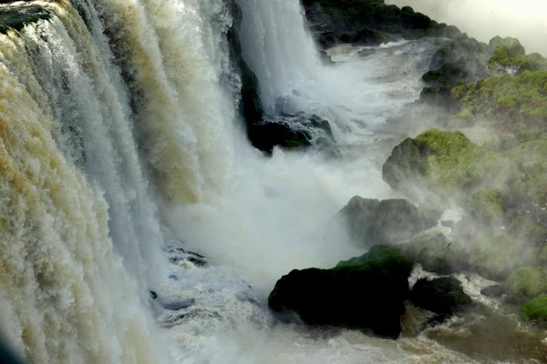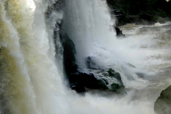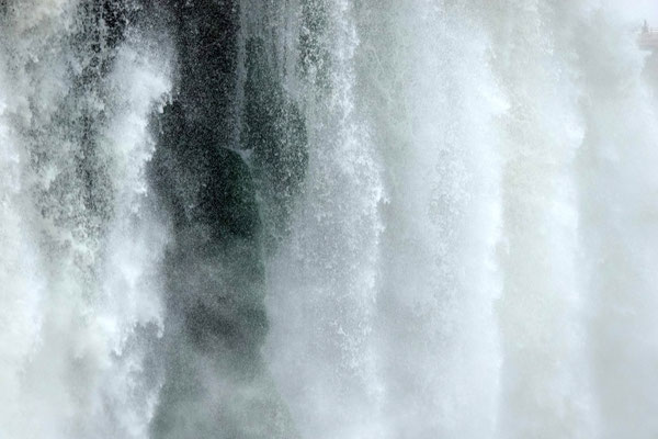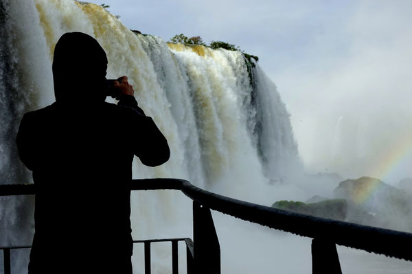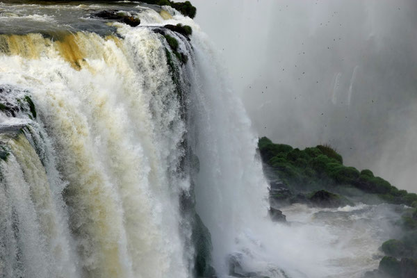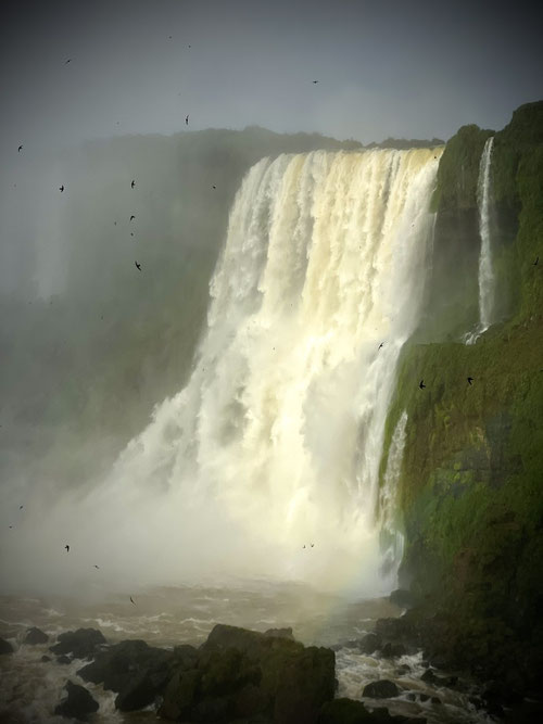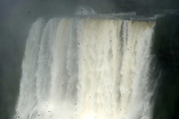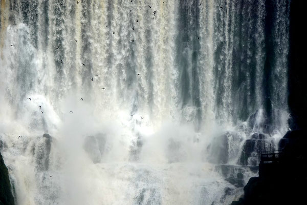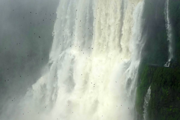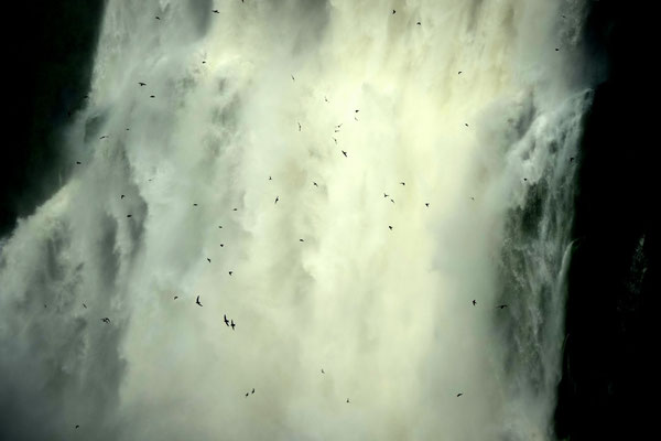 Wir gehen weiter über die Stege, das Rauschen wird immer mächtiger. Am äussersten Punkt stehen wir ganz allein über dem brodelnden Abgrund. Der Sprühnebel macht uns zu triefenden Pudeln, Regenbogen leuchten, und grosse Fahlsegler stürzen sich halsbrecherisch durch die Fluten – vielleicht mit Beute für hungrige Jungvögel.
