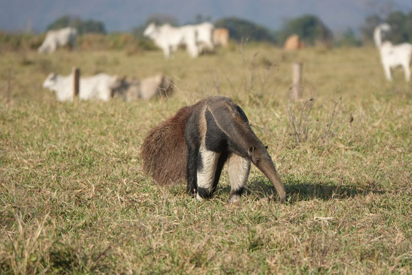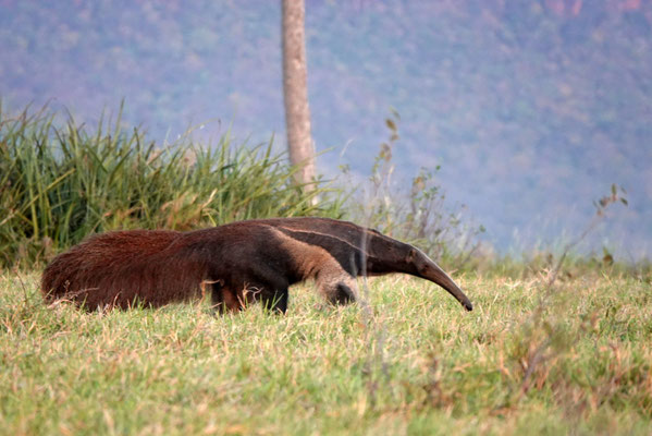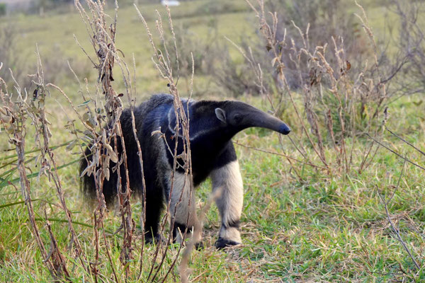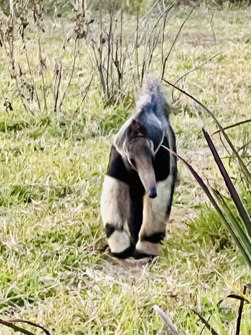 Und dann: Treffer! Ein grosser brauner Ameisenbär trottet durchs Feld. (Ja, ich hatte ihn für heute „manifestiert“ – lateinisch manifestare = „offenbar machen“ – und siehe da: funktioniert!) Dani vergisst augenblicklich die Reifen und schleicht sich mit der Kamera an. Ich klettere aufs Dach und dirigiere ihn mit Armzeichen – und entdecke von oben gleich noch einen zweiten «Bären».