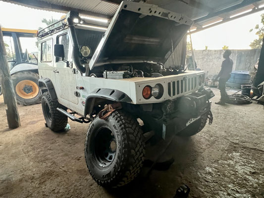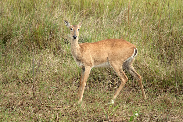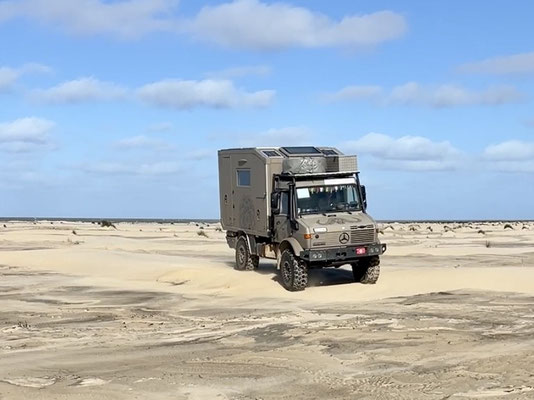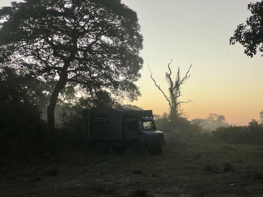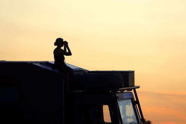 Kaum hat Dani den Motor abgestellt, um dem Unimog seinen wohlverdienten Feierabend zu gönnen, greife ich zum Fernglas. Dani will noch Luft aus den Reifen lassen, bevor wir die Wellblechpiste verlassen und ins hohe Gras fahren – doch dafür fehlt mir gerade die Geduld.