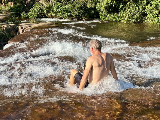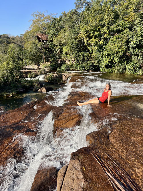 Nach einem erfrischenden Bad im kristallklaren Naturpool und einer kräftigen Massage unter dem Wasserfall verlassen wir den Badeort Balneário Sete Quedas do Didi im Eiltempo. Bei dieser Hitze und den staubigen Fahrten über rotsandige Pisten war das die perfekte Staub- und Schweisskur – einmal komplett durchgewaschen. Frisch, sauber und voller Tatendrang setzen wir die Suche nach einem Nachtplatz fort.