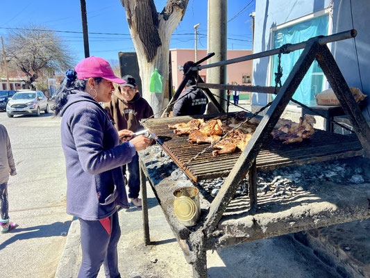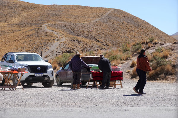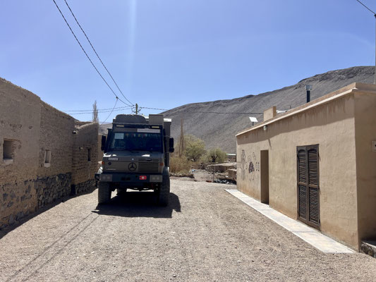 Zum Wasserauffüllen machen wir einen Abstecher nach Antofagasta de la Sierra. Während Dani die Tanks füllt, ziehe ich neugierig durchs Dorf – meine Paradedisziplin. Tatsächlich gibt es hier eine kleine Bäckerei, die am Samstag ein rundes Brot aus Zopfteig anbietet. Und als Krönung entdecke ich Danis Lieblingskuchen: Linzertorte! Kaum habe ich die Schätze präsentiert, fährt auch noch der Eier- und Gemüsewagen vor. Schnell ein paar Kleinigkeiten eingekauft, und wir sind bestens gerüstet für weitere Tage in der Abgeschiedenheit.