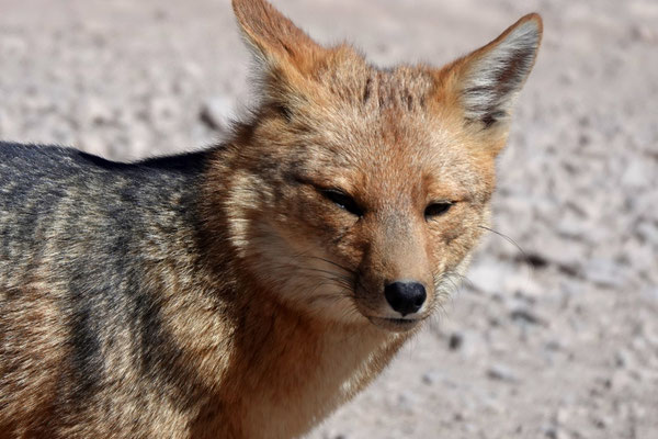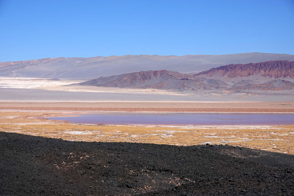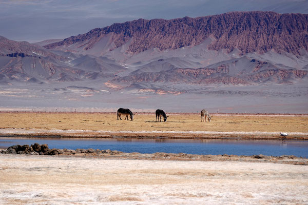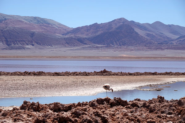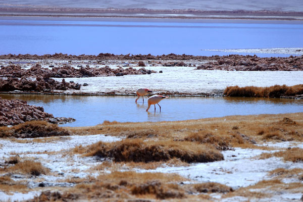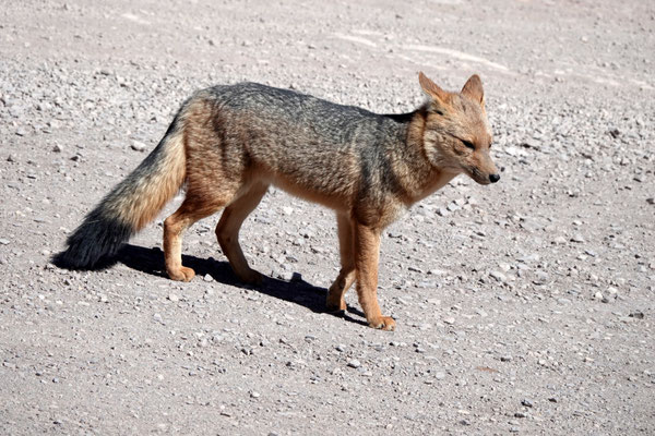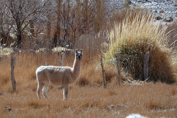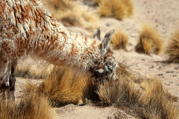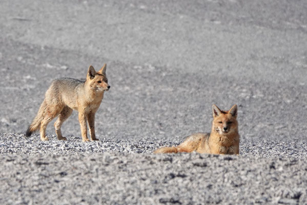 Die Laguna Diamante liegt mitten im Krater des Vulkans Galán, einer der grössten Calderavulkane der Puna mit über 35 Kilometern Durchmesser. Die Anfahrt führt vorbei an der Laguna Grande, wo uns hunderte Flamingos im eisigen Wind empfangen. Schulter an Schulter stehen die rosa Vögel im flachen Wasser, während wir schon nach wenigen Minuten halb erfrieren. Am Rand ist die Lagune gefroren, wir wagen ein kleines Tänzchen auf dem Eis, beobachtet von neugierigen Füchsen. Und wir sehen unsere ersten Lamas – nach Nandus, Guanakos und Vicuñas nun ein weiterer Andenbewohner auf unserer Liste.