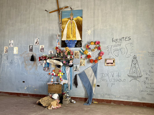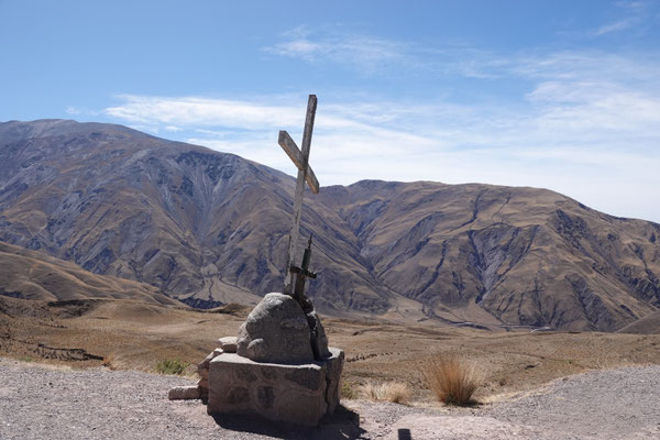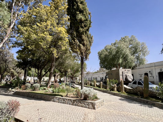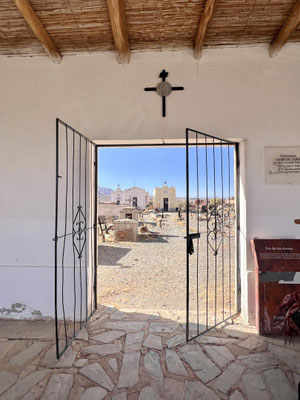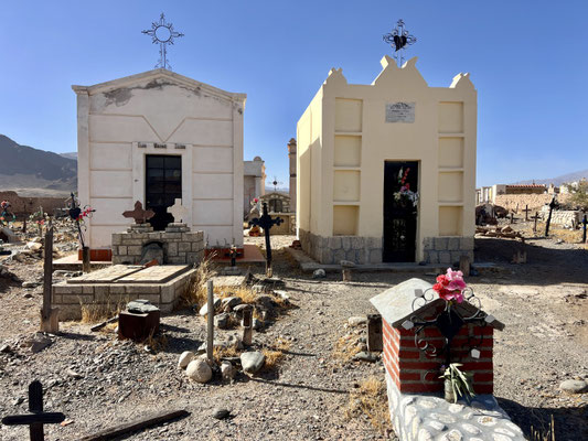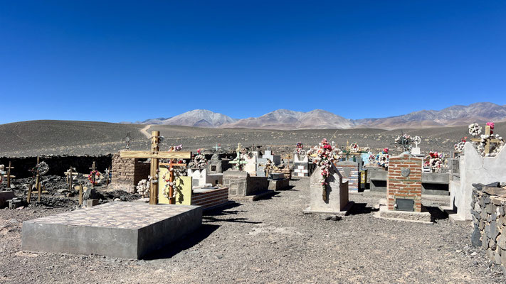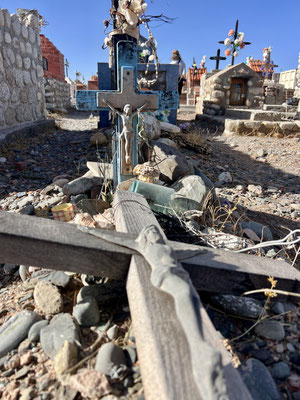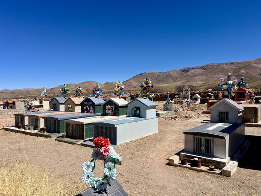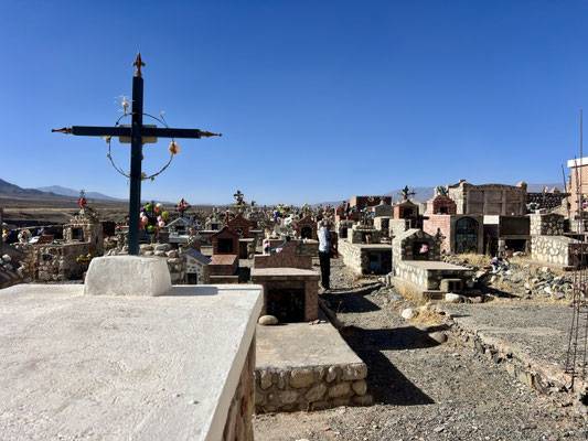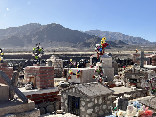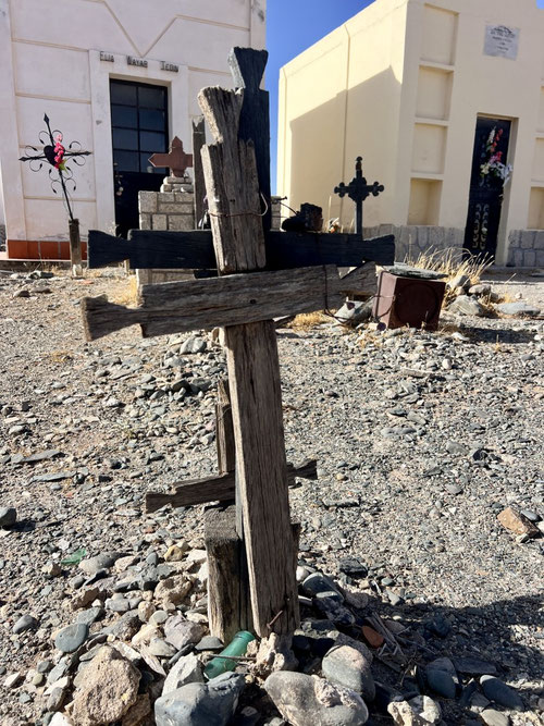 Konzentriert rollt Dani hinunter nach Cachi. Der Ort erweist sich als überraschend hübsch, ruhig und voller Charme. Kleine Restaurants laden zum Verweilen ein, in den Gassen entdecken wir Handwerkskunst aus Kakteenholz, das hier reichlich wächst. Beim Flanieren stossen wir auf den kleinen Friedhof am Dorfrand: weisse Grabmäler, geschmückt mit bunten Plastikblumen, Kreuze aus Holz oder Metall – schlicht, manchmal liebevoll gestaltet. Manche Gräber sind alt und verwittert, andere frisch gepflegt. Solche Friedhöfe erzählen überall auf der Welt ihre eigenen Geschichten – über Menschen, die hier lebten und gingen.