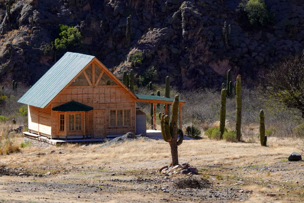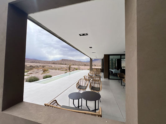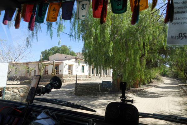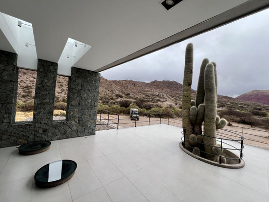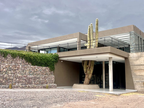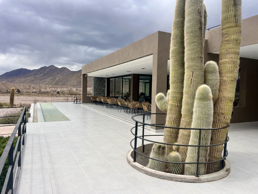 Nach wenigen Minuten, die Piste wird immer rauer, erscheint oberhalb plötzlich ein spektakuläres Gebäude. Moderner, puristischer Baustil – ein starker Kontrast zu den einfachen Lehmhäusern der Umgebung. Was ist das? Zwischen den Reben eingebettet entpuppt es sich als Weingut – und als Restaurant. Ein Gourmettempel mitten in der Quebrada!