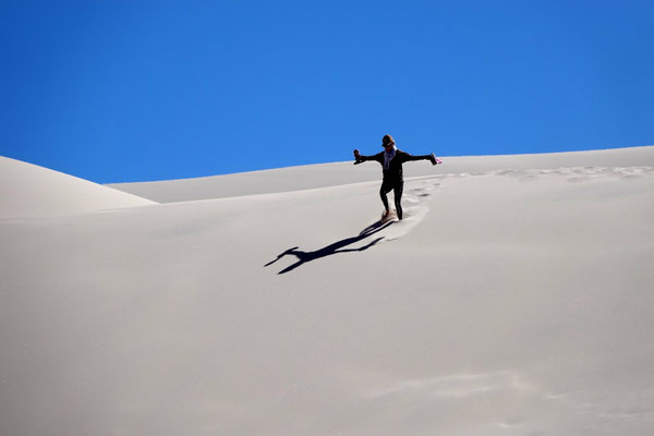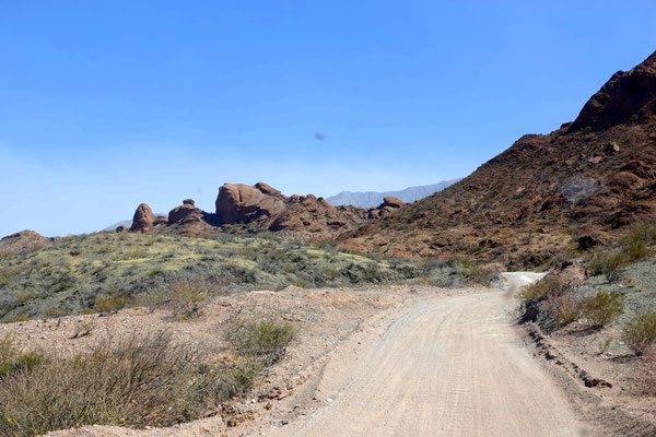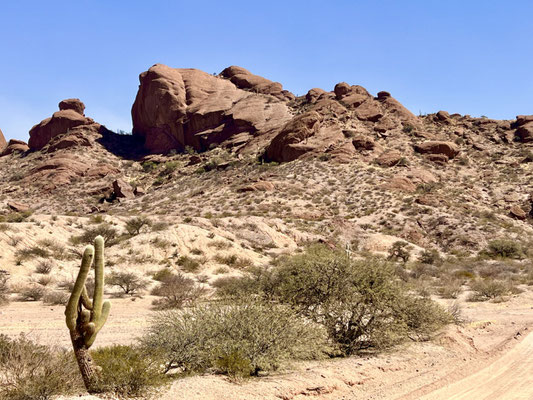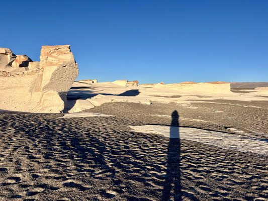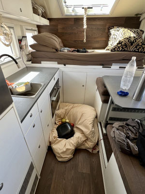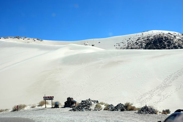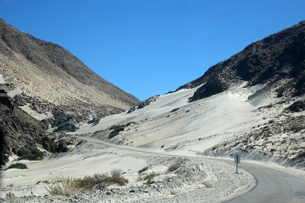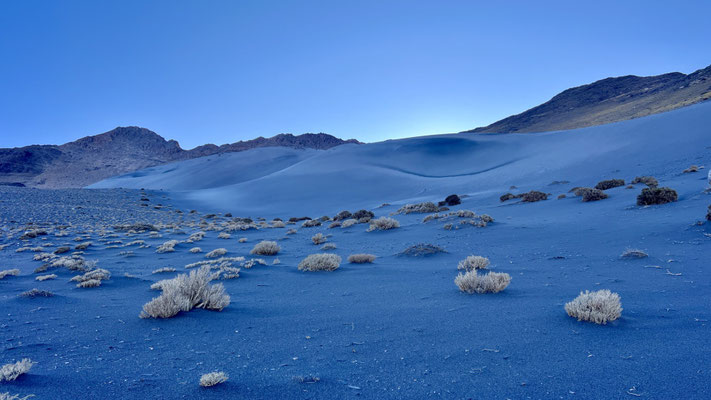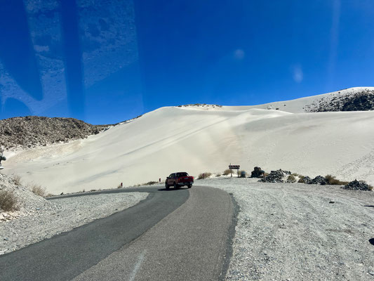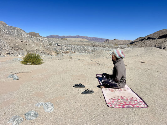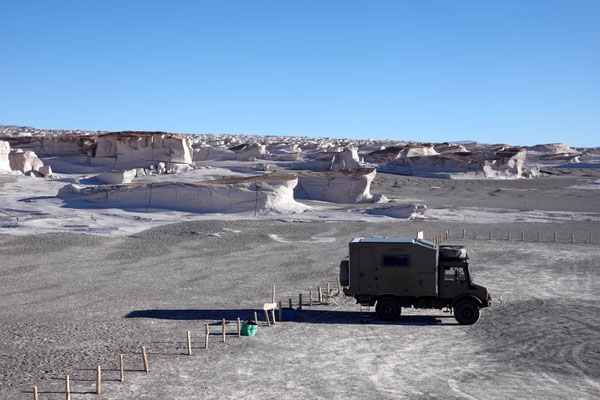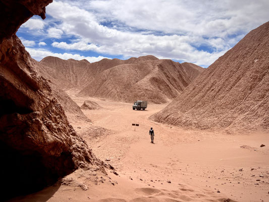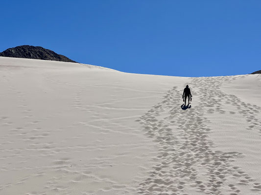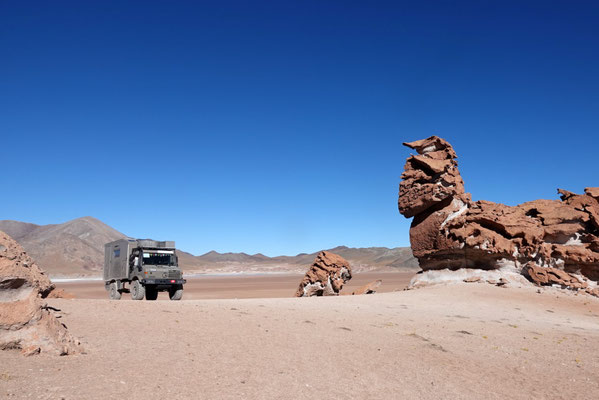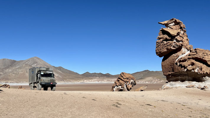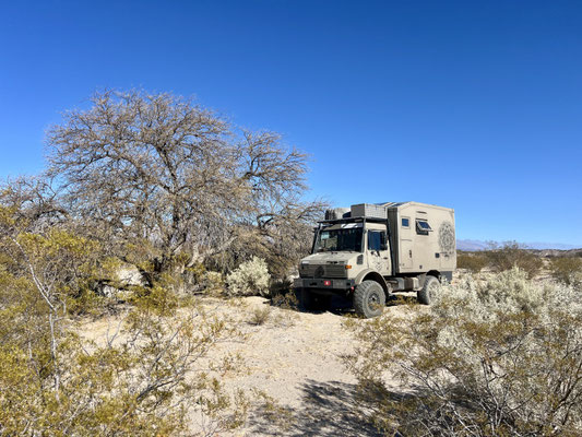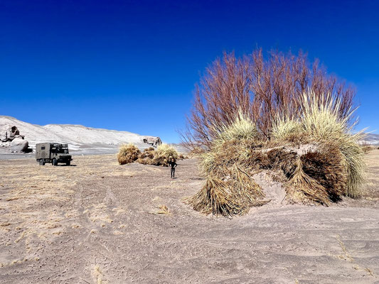 Für die Nacht finden wir in der Einsamkeit einen Stellplatz nach unserem Geschmack. Dani fährt kurzerhand durch tiefen Sand – warum eigentlich? Mit abgesenktem Reifendruck schaffen wir es ohne Schaufeln. Für ihn ist es ein Spielplatz für grosse Jungs, für mich bleibt es ein mystisches Rätsel.