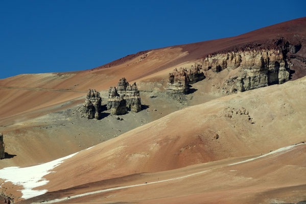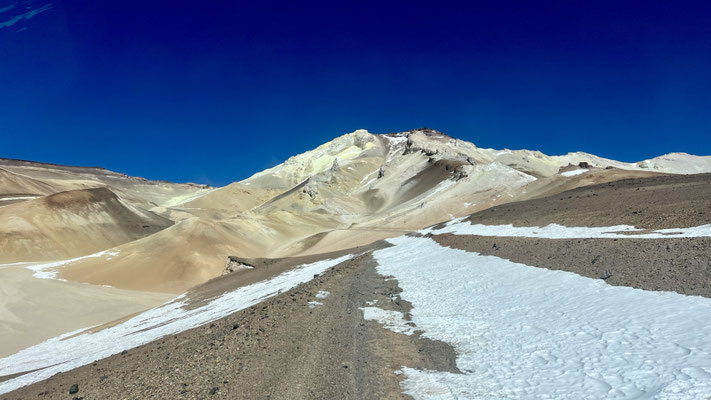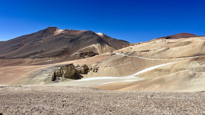 Auf dem Weg zur bolivianischen Grenze fällt uns links ein mächtiger, mehrfarbiger Berg ins Auge – der Cerro Pollera de Coya. Seine Schönheit zwingt uns förmlich zum Anhalten. Dani studiert die Karte, findet eine kleine Abzweigung, und wir biegen ab. Eine schmale Naturstrasse führt uns näher heran.