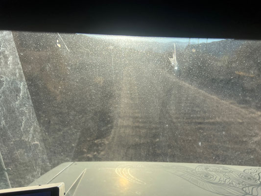 Früh am Morgen brechen wir nach Salta auf. Eine lange Pendenzenliste wartet – doch unterwegs zeigt sich das wahre Ausmass der letzten Sandstürme: Unsere Frontscheibe ist übersät mit tausenden feinen Einschlägen. Im Sonnenlicht bricht es sich wie in einem Kaleidoskop – schön anzusehen, aber gnadenlos beim Fahren. Der Fachmann bestätigt: «Mas profundo» – zu tief, um zu polieren. Eine neue Scheibe muss aus Deutschland her, diesmal mit Schutzfolie. Auch am Kühlergrill ist der Schwund sichtbar – Mercedes-Benz Sterne farblos, einer gar zerbrochen. Ein bisschen Verlust gehört wohl dazu.
