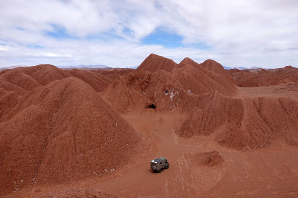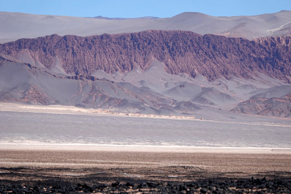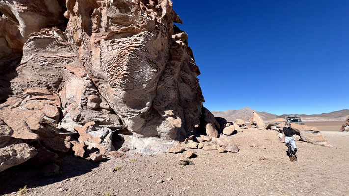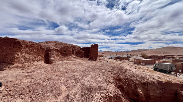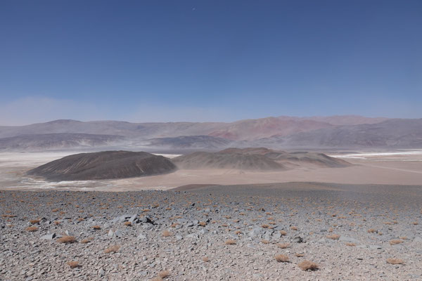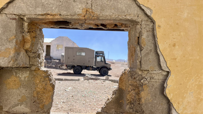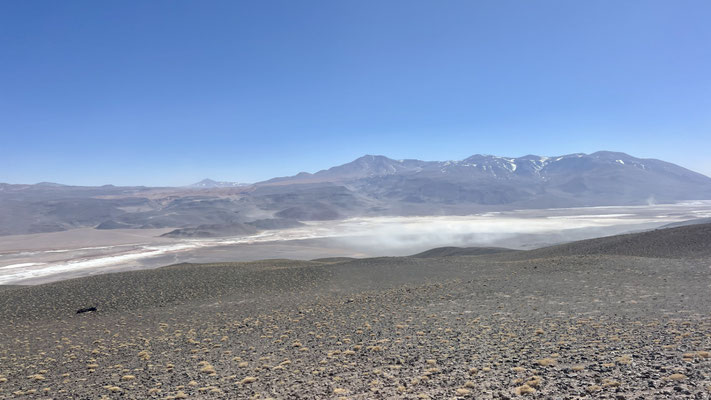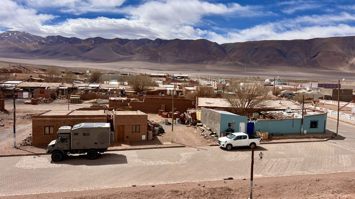 Weiter geht es über Stock und Stein, vorbei an Lagunen und über den Abra Kolla Atacamena Pass auf 4600 Metern. Die Route führt quer über den Salar de Antofalla, einen der längsten Salare der Erde, unter dessen Kruste Borax, Lithium und Natriumcarbonat lagern. In Antofalla, einem Dorf mit rund 60 Bewohnern, legen wir einen kurzen Stopp ein. Hier lebt man noch in einfachen Lehmhütten, das Leben wirkt bescheiden und unverändert. Manchmal frage ich mich, wie mein Leben wohl verlaufen wäre, wenn ich hier geboren wäre. Fotos gibt es heute kaum – ich habe ein «Kameraverbot» erhalten. Der Wind bläst so stark, dass Sandstürme toben. Ich bin gespannt, ob unser Autolack das aushält.