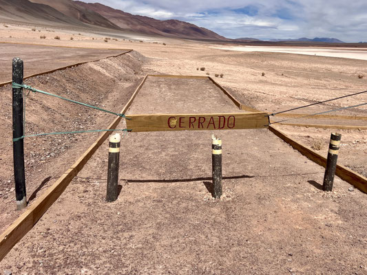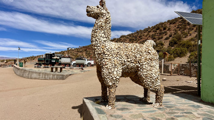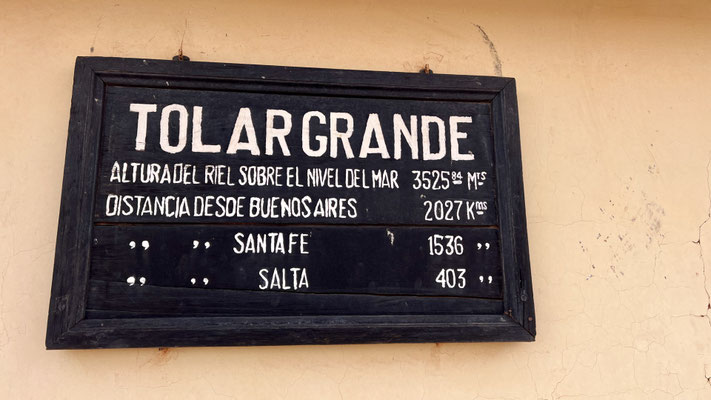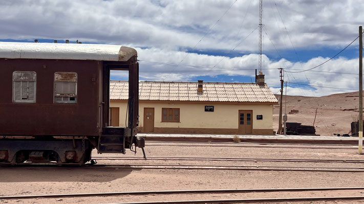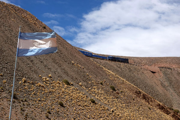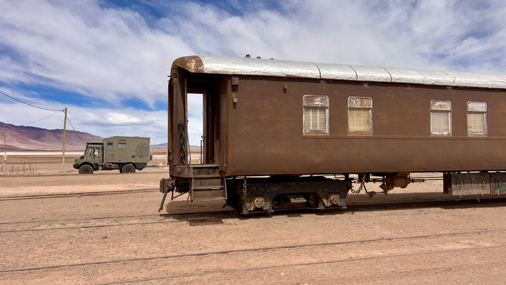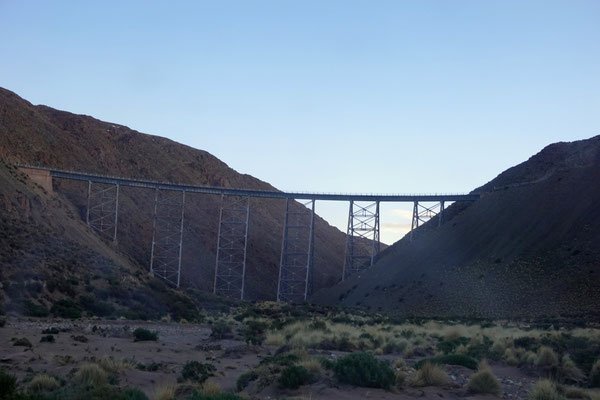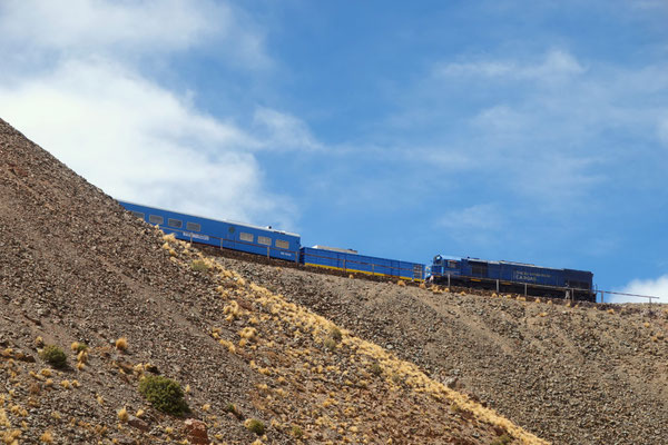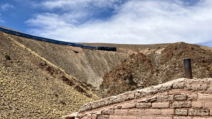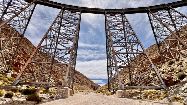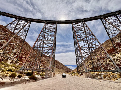 Nur um wenige Minuten verpassen wir den berühmten Zug – schuld sind kleine Sandhügel und ein notwendiges Dieselanpumpen – wir haben den kleinen Tank leergefahren. Also bleibt uns, das Bild im Kopf entstehen zu lassen: der blaue «Tren a las Nubes», der auf 4200 Metern über das beeindruckende Bauwerk fährt.