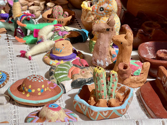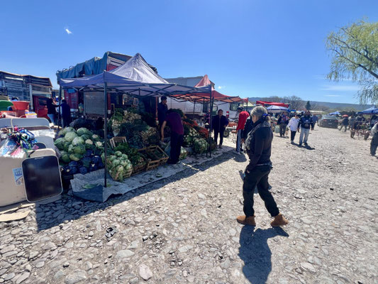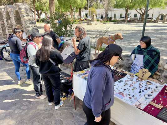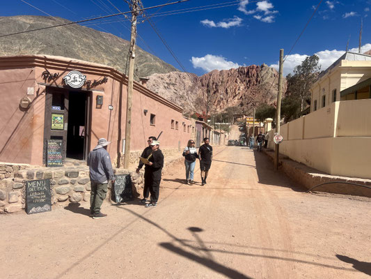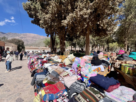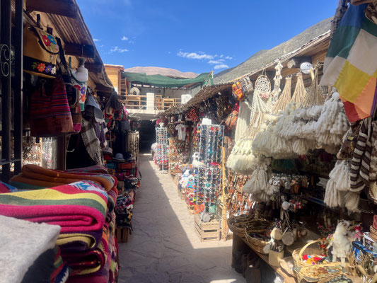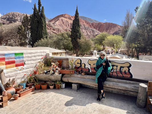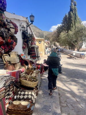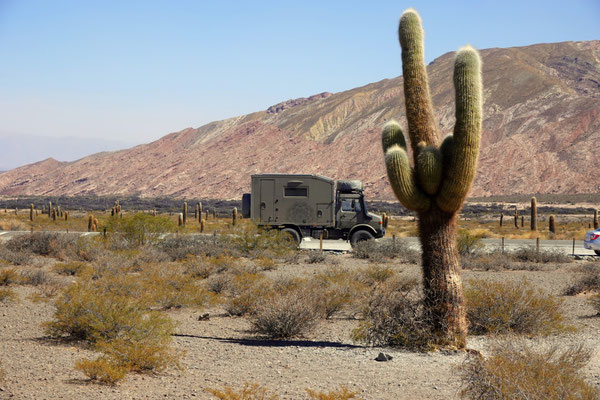 In Purmamarca finden wir einen Stellplatz mit Sicht auf Lamas, die ich abends mit dem Farmer füttern darf. Sie stürzen sich begeistert auf unseren Gemüseabfall. Auffällig sind die bunten Märkte – Tücher, Ponchos, Kappen – hier sind wir bei den Indigenen angekommen. Die Atmosphäre ist lebendig, laut, farbig und voller Musik. Auch in Tilcara erleben wir dieses Ambiente, eingebettet in eine Landschaft aus farbigen Felsen, Kakteen und einsamen Tälern.