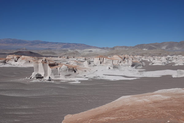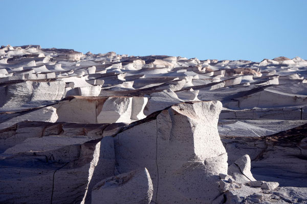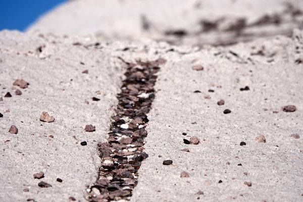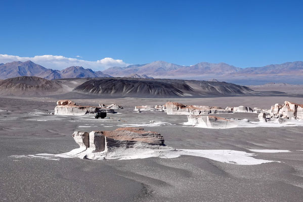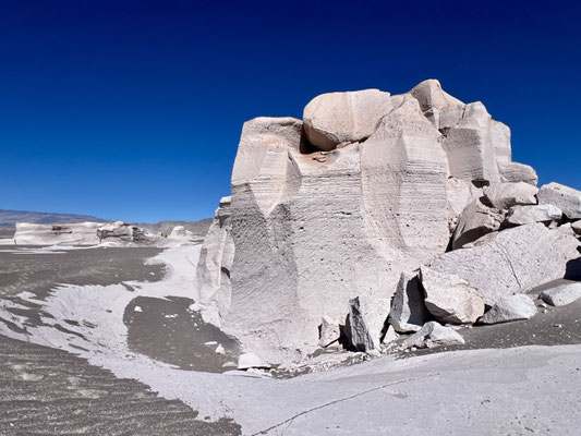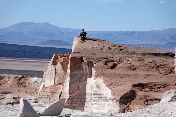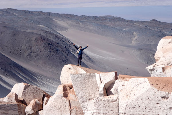Die Fahrt hierher ist bereits ein Erlebnis: über einen 4000er Pass hinunter in die weite Ebene, wo die ersten Vicuñas am Horizont auftauchen. Glücksgefühle breiten sich aus – und dann, plötzlich, dieses bizarre Meer aus weissgrauen Felsformationen. Der Campo de Piedra Pómez wirkt wie eine Landschaft von einem anderen Planeten. Wir stehen hier völlig alleine im Wind, nur wir und die Stille.