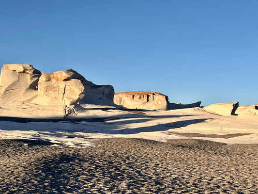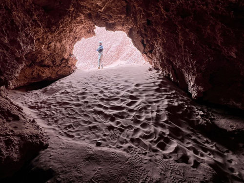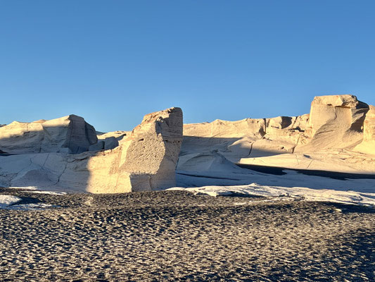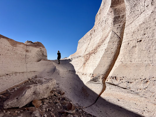 Ich dagegen geniesse den Sonnenaufgang: die ersten Strahlen tauchen die weissen Felsen in warmes Rot. Zwar ist die Kamera leer, aber mit dem Handy halte ich die Stimmung doch noch fest. Die Landschaft hat vulkanischen Ursprung: eine gewaltige Explosion vor etwa 73'000 Jahren formte diese Welt aus Bimsstein, die seither vom Wind zu bizarren Skulpturen modelliert wurde.